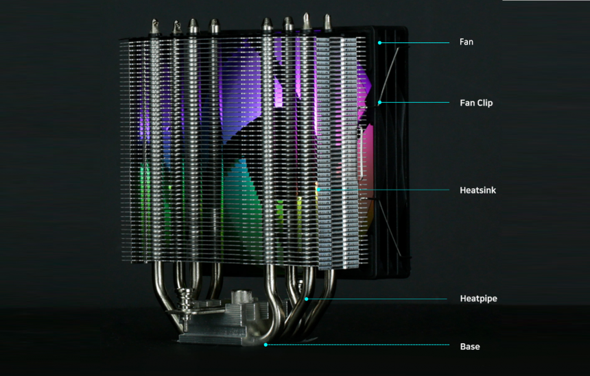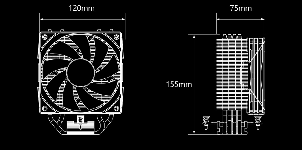 • Радіатор баштового типу заввишки 155 мм (із тепловими трубками) з тонкими алюмінієвими пластинами та раціональною конструкцією для активного тепловідведення за сумісними параметрами з більшістю сучасних корпусів.