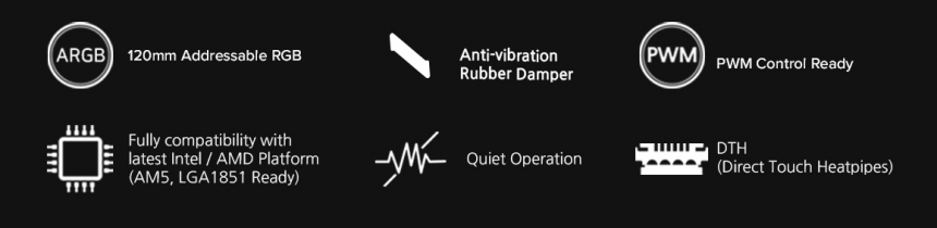 • Кулер виготовлено із застосуванням технології DTH (технологія прямого контакту), яка застосовується для збільшення розсіювання тепла від процесора та підвищення продуктивності охолодження.