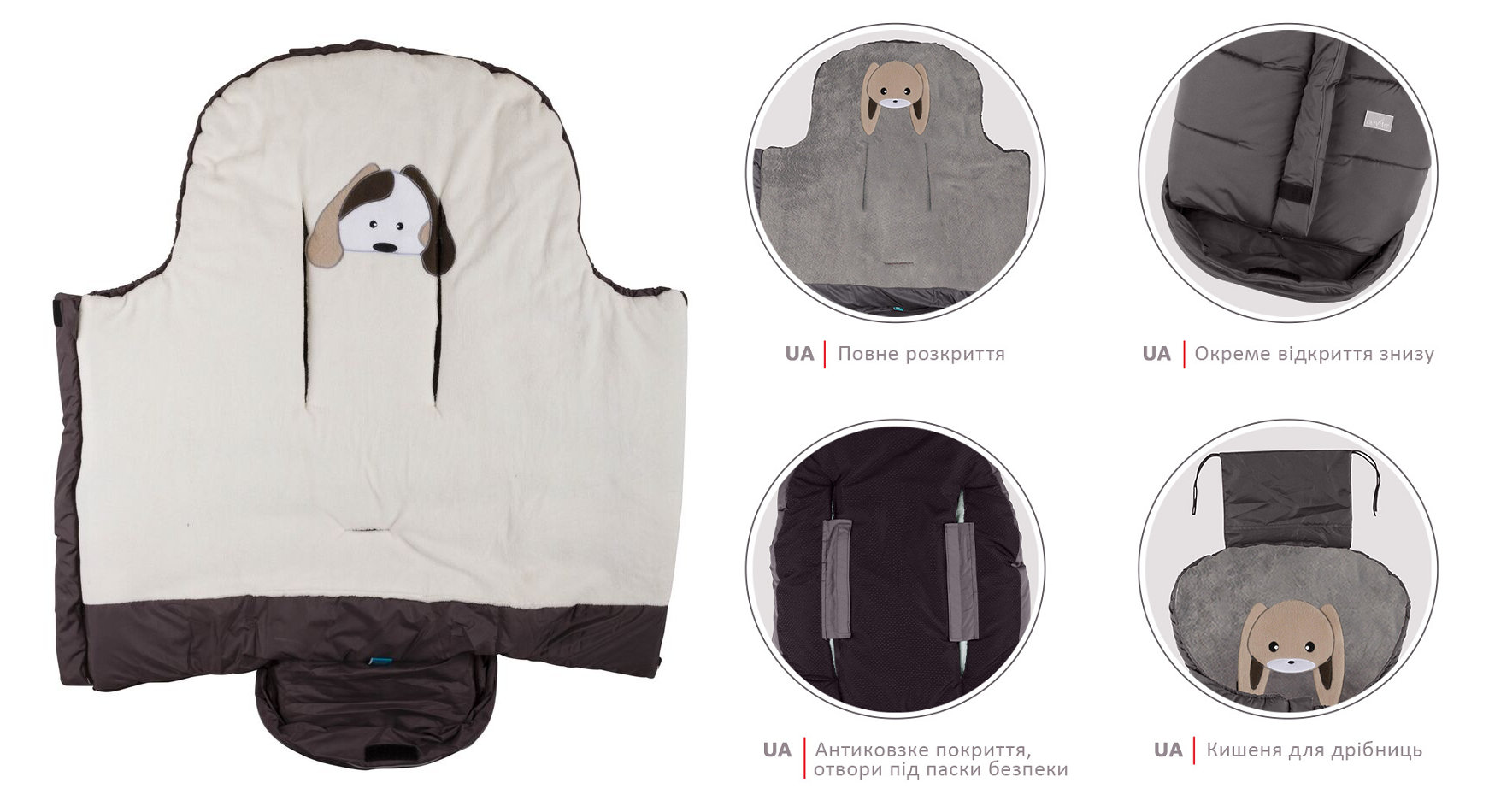 • Адаптивний дизайн дає можливість закріпити конверт у візку, автокріслі тощо. Багато моделей повністю розкладаються в килимок для ігор (під наглядом дорослих).