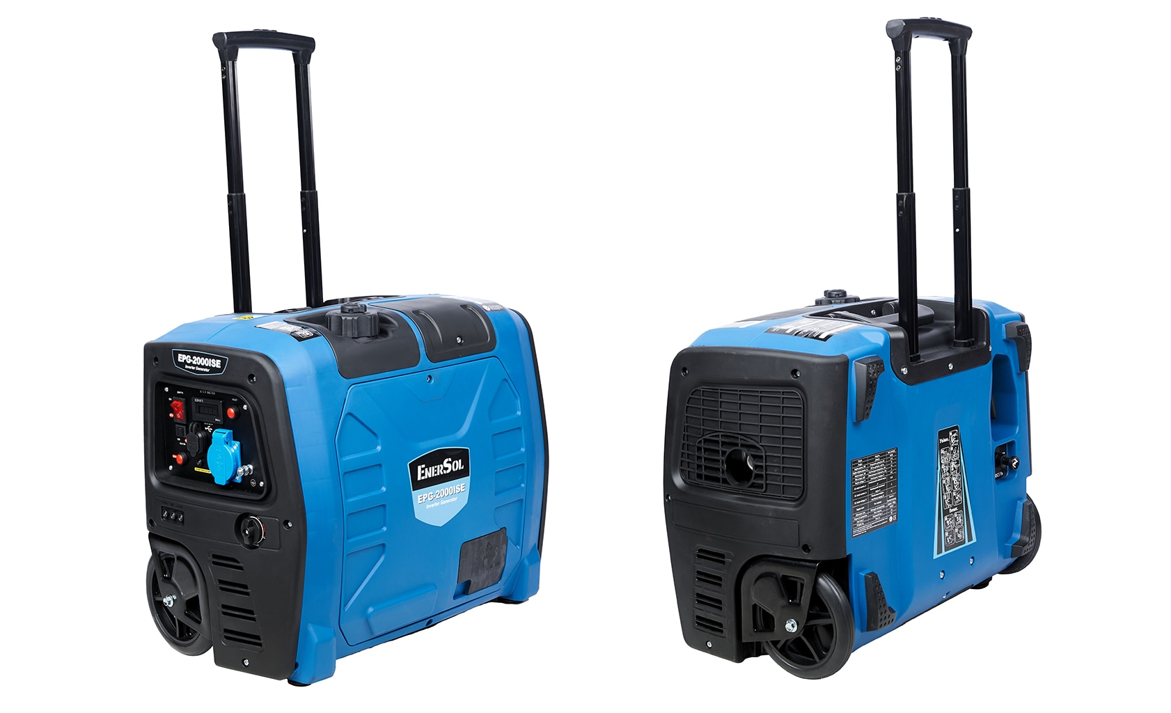 EnerSol EPG-2000ISE – портативний бензиновий генератор, який можна пересувати навіть однією рукою. Завдяки колесам і телескопічному руків’ю модель подібна до валізи – мобільна, зручна та пристосована до експлуатації чи не будь-де: вдома, на дачі, у кемпінгу чи під час виїзних робіт.