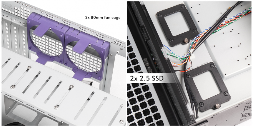 Корпус підтримує 360-мм систему рідинного охолодження (AIO) та сумісний із материнськими платами формату SSI-EEB. Передбачено можливість встановлення стандартного блока живлення ATX або резервного мініблока, що розширює сценарії використання.