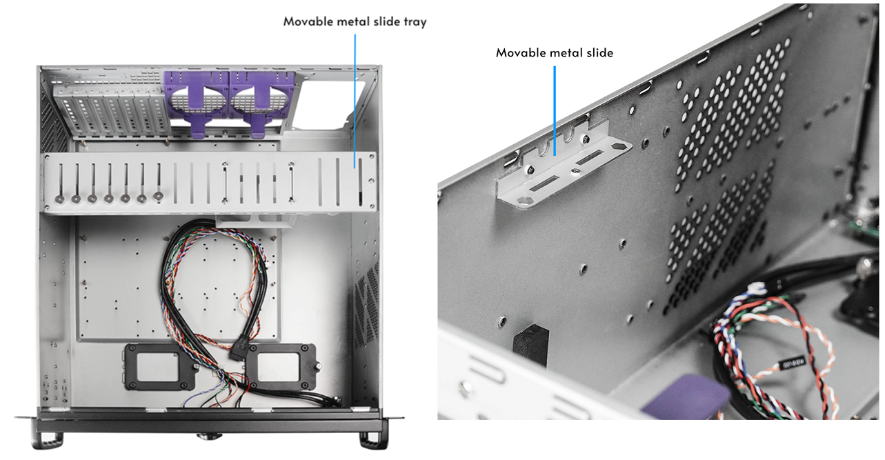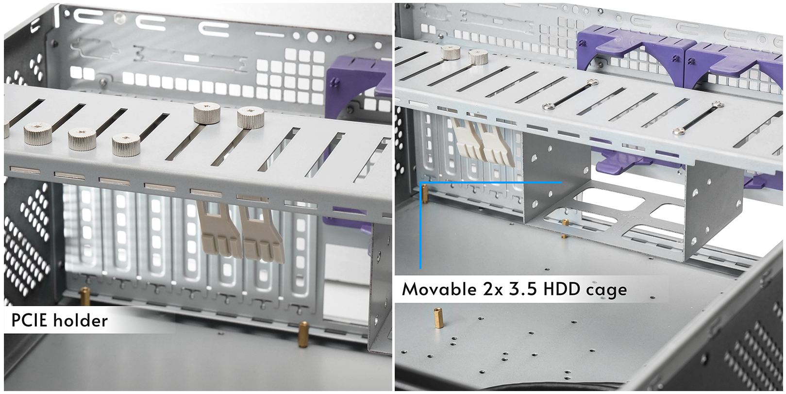 Конструкцію виготовлено зі сталі SGCC завтовшки 1,2 мм, забезпечуючи стійкість до механічних пошкоджень і надійний захист внутрішніх компонентів. Рухомі металеві тримачі спрощують монтаж і технічне обслуговування, а продумана архітектура гарантує ефективне охолодження та гнучкість зберігання даних.