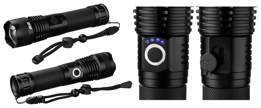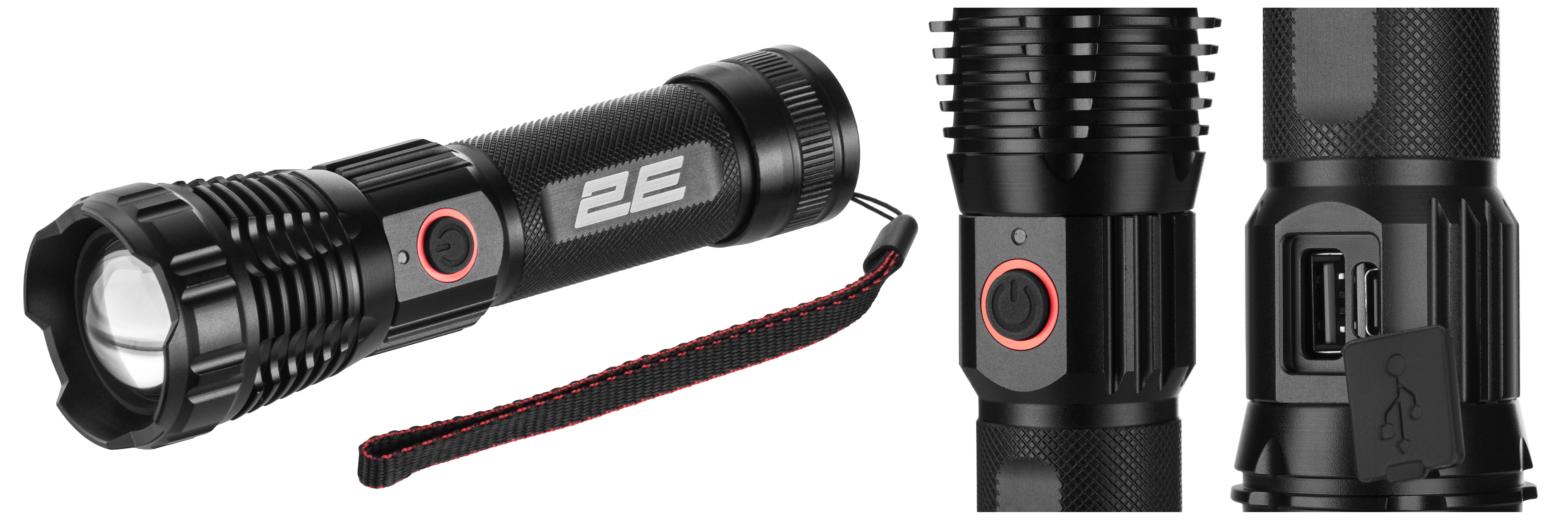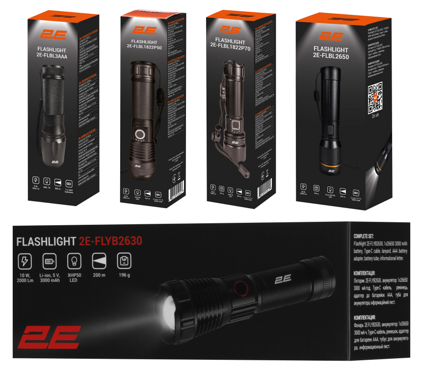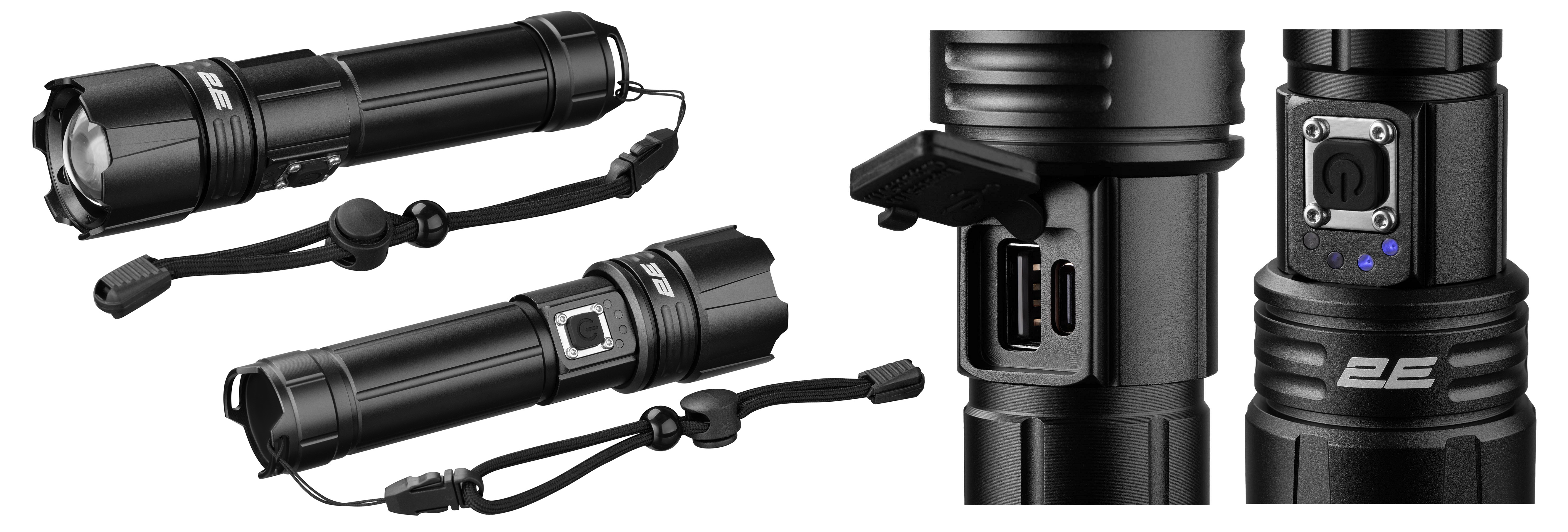 Наприклад, ручний ліхтар 2E-FLYB2630 оснащено світлодіодом XHP50 зі світловим потоком – 2 000 лм і дальністю променя – до 200 м. П’ять режимів світіння (максимальний, середній, економний, стробоскоп та аварійний (режим SOS)) і зум формують гнучке налаштування променя відповідно до ситуації. Час роботи – до 4 год за максимального рівня та до 8 год за економного. Передбачено функцію повербанка, забезпечуючи можливість заряджати мобільні пристрої в дорозі. У комплекті – акумулятор, адаптери, кабель USB Type-C, ремінець та інформаційний лист. Захист – IP68, що гарантує стійкість до вологи та пилу.