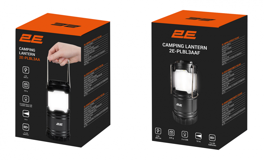 Кемпінговий ліхтар 2E-PLBL3AA зі світловим потоком 200 люмен має два типи світіння: «полум’я» та біле LED-освітлення потужністю 3 Вт. Дальність світла становить 10 м. Корпус чорного кольору виготовлено з пластику, клас захисту IP44. Ліхтар має висувну складану конструкцію, зум для регулювання діаметра світлового променю та п’ять режимів освітлення: потужне, середнє, низьке, стробоскоп та SOS. Працює від трьох батарейок АА, час роботи становить від 2 до 5 годин.