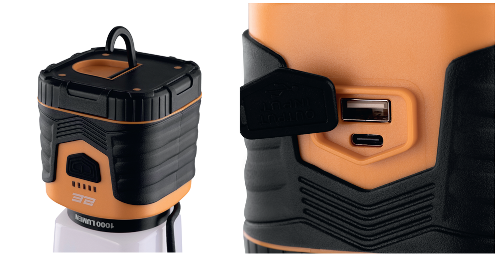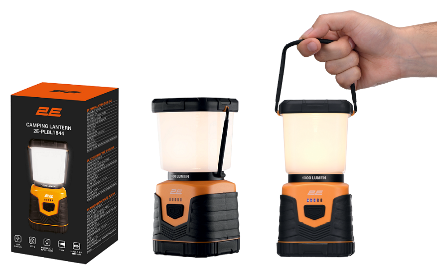 З-поміж кемпінгових моделей примітною є 2E-PLBL1844 потужністю 10 Вт, яка забезпечує світловий потік до 1 000 лм. Завдяки акумулятору ємністю 4 400 мА·год час роботи пристрою за змішаного світіння становить приблизно 8–10 год. Передбачено чотири режими: холодний білий, теплий білий, природний білий і мерехтіння. Також ліхтар виконує функцію повербанка, що дає змогу підживити телефон або інший USB-пристрій у разі потреби. Корпус виготовлено з ударостійкого ABS-пластику й термопластичної гуми, а захист IP44 гарантує стійкість до пилу та вологи. У комплекті: ліхтар, вбудований акумулятор, кабель USB Type-C та інформаційний лист.