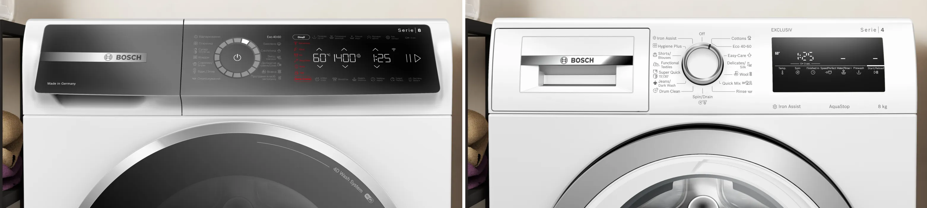 Вирізняються енергоефективністю класу A, тихою роботою завдяки EcoSilence Drive та інтелектуальними програмами прання. Доступні функції віддаленого керування через Home Connect, а також опції SpeedPerfect і HygienePlus, які скорочують час прання та забезпечують гігієнічне оброблення білизни.