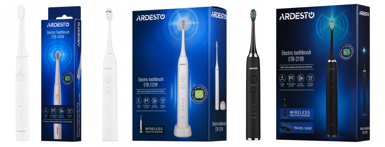 Електрична зубна щітка – справжній помічник у догляді за ротовою порожниною, з яким щоденне чищення є ефективним, зручним і приємним. Щітки ARDESTO створено, аби дбати про здоров’я та красу усмішки. У лінійці доступні три моделі (ETB-101W, ETB-112W та ETB-211B), кожна з яких має особливості, що задовольнять потреби навіть найвибагливіших користувачів.