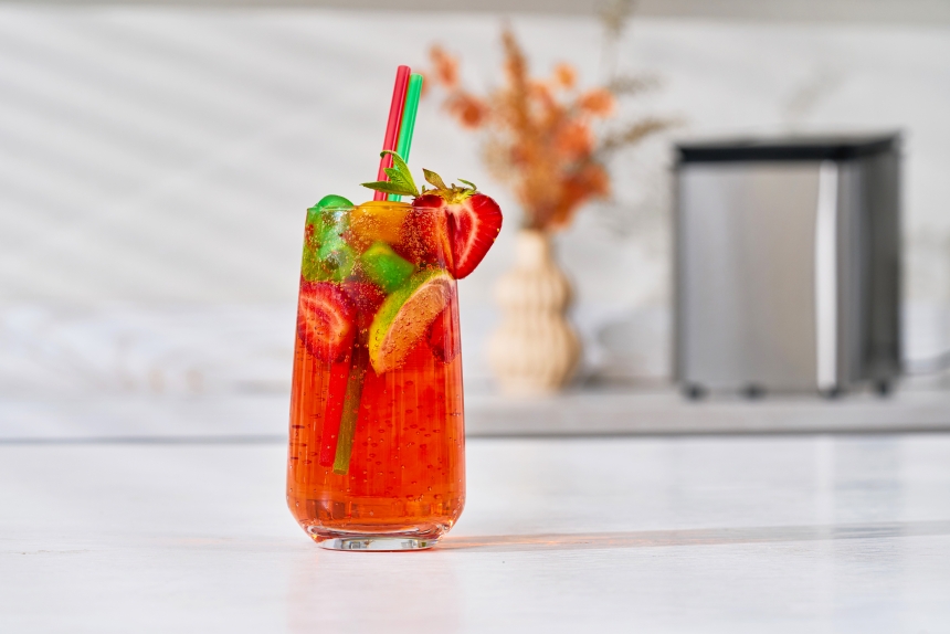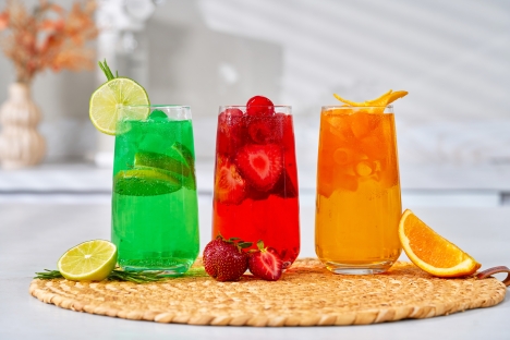 • Сиропний акцент: газована вода з тонким шаром сиропу на дні (лимонного, персикового чи малинового) і контрастними крижинами зверху створює ефект багатошаровості.