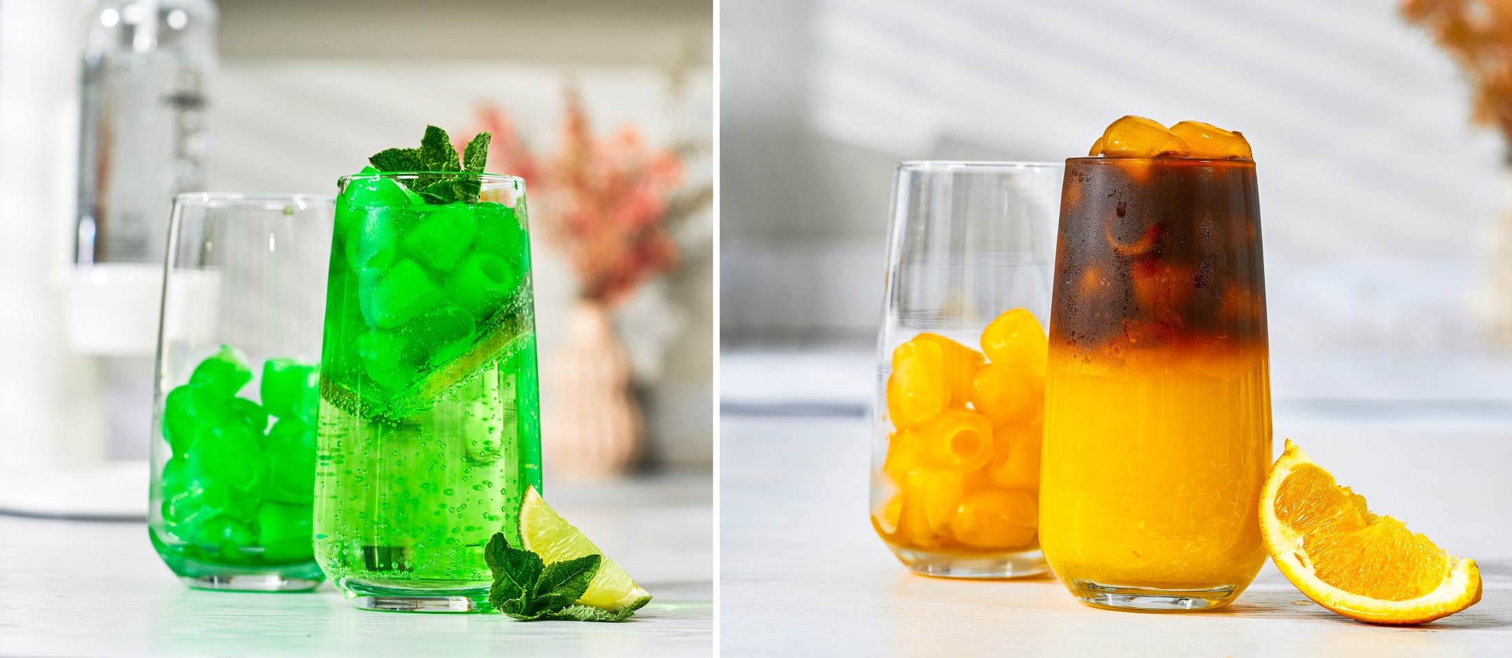 • Зелений мохіто: класичне поєднання м’яти, лайма та лимона з зеленими крижинками дарує освіжний аромат і насичений колір.