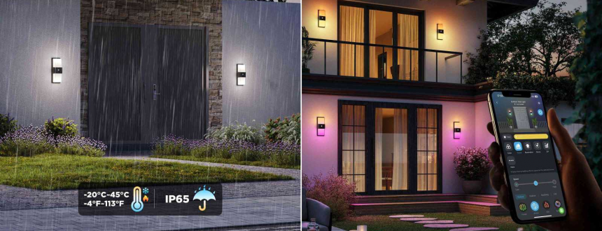 Govee H7078 – розумний зовнішній настінний світильник, що поєднує RGBICWW підсвічування та яскраве біле світло до 1500 лм. Він створює різноманітні світлові ефекти для тераси, фасаду чи подвір’я та підтримує синхронізацію з музикою. Завдяки керуванню через застосунок, голосовим помічникам і підтримці Matter користування стає максимально зручним. Алюмінієвий корпус із класом IP65 забезпечує надійність у будь-яку погоду.