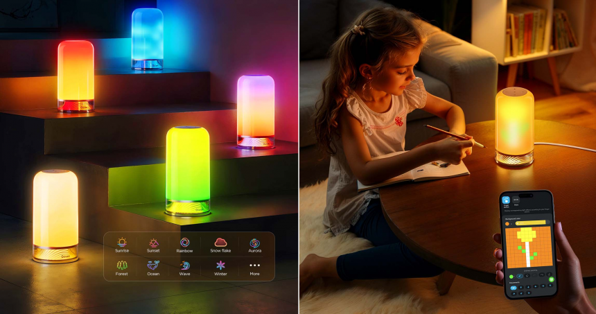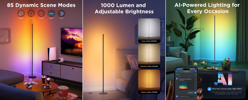 Розумний кутовий торшер Govee H8076 із RGBICW-підсвічуванням пропонує динамічні сцени з теплими та холодними білими кольоровими опціями, регулювання яскравості та компактний дизайн. Підтримується музична синхронізація й керування через застосунок або голос. Модель можна органічно розмістити в кутку кімнати, створюючи рівномірне вертикальне світло.