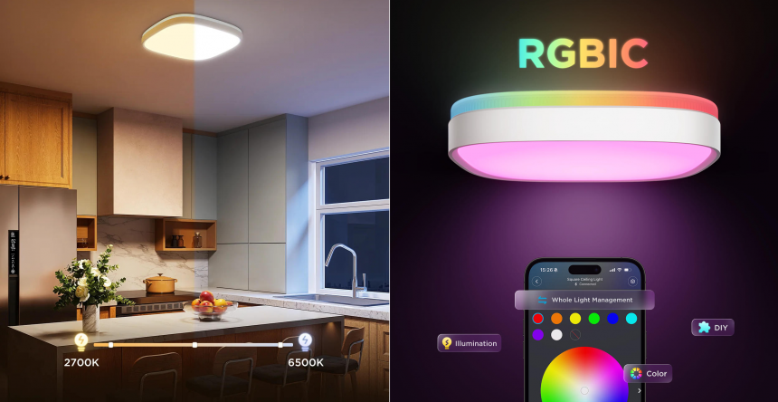 Govee H60A4 – розумний квадратний стельовий світильник із поєднанням RGBWW та RGBIC підсвічування, що дозволяє повністю персоналізувати освітлення у кімнаті. Потужність 2400 лм та плавне регулювання колірної температури забезпечують комфорт у різних сценаріях — від затишного тепла до продуктивного холодного світла. Понад 70 світлових сцен адаптуються під будь-який настрій, а керування через додаток чи голосову команду робить користування простим. Стильний квадратний дизайн легко інтегрується у сучасний інтер’єр.