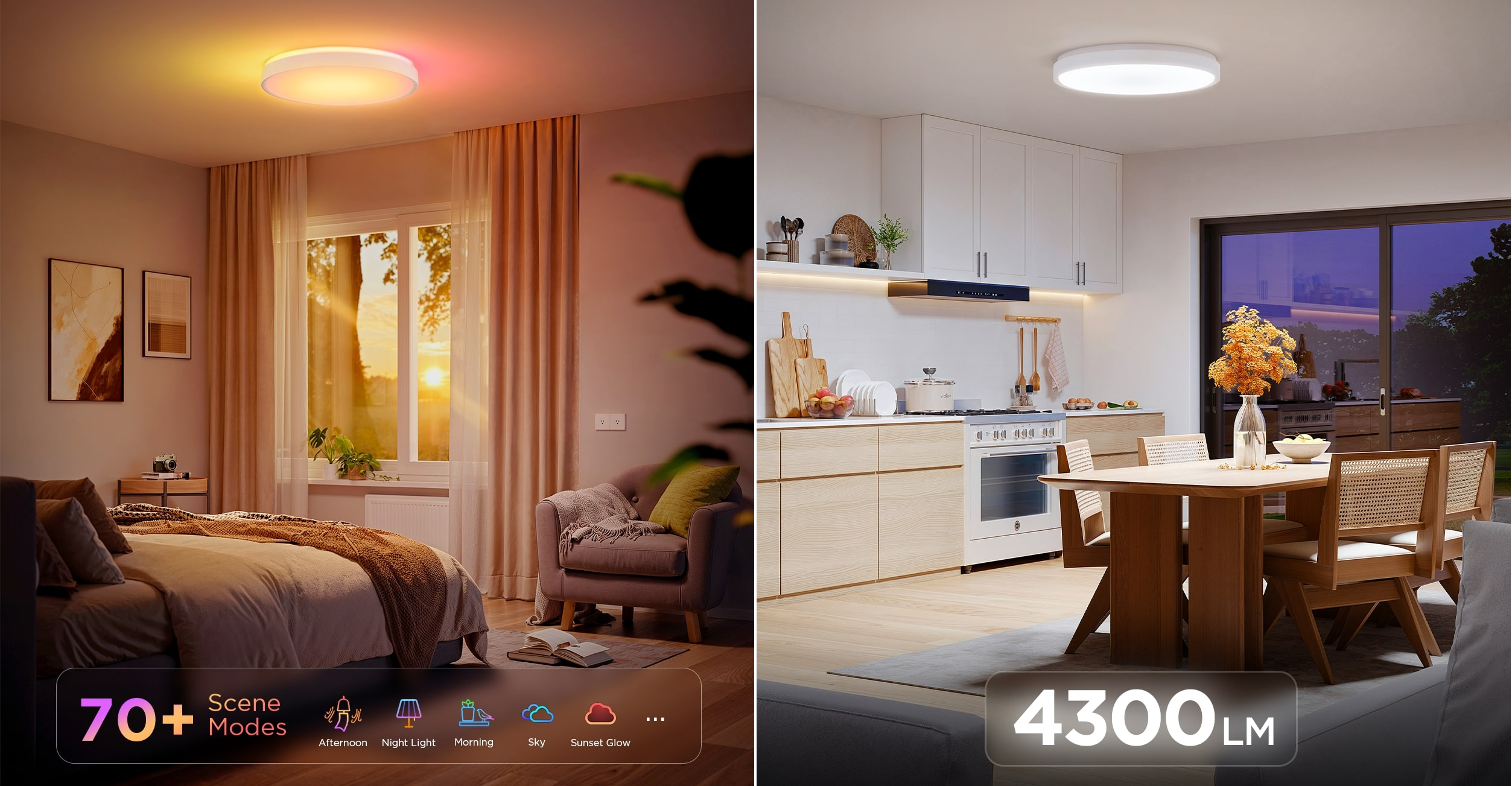 Стельовий світильник Govee Smart Ceiling Light Pro, 38 см: модель із багатосегментною структурою – 121 зона підсвічування, розташована в п’яти концентричних колах. Яскравість 4300 лм забезпечує освітлення приміщення, що на 45 % яскравіше за звичайне освітлення, тож стане в пригоді для багаторівневого освітлення. Доступно понад 66 режимів сцени, музичні режими та повна інтеграція з розумними екосистемами. Світильник монтується в кілька кроків і пасуватиме до сучасних інтер’єрів.