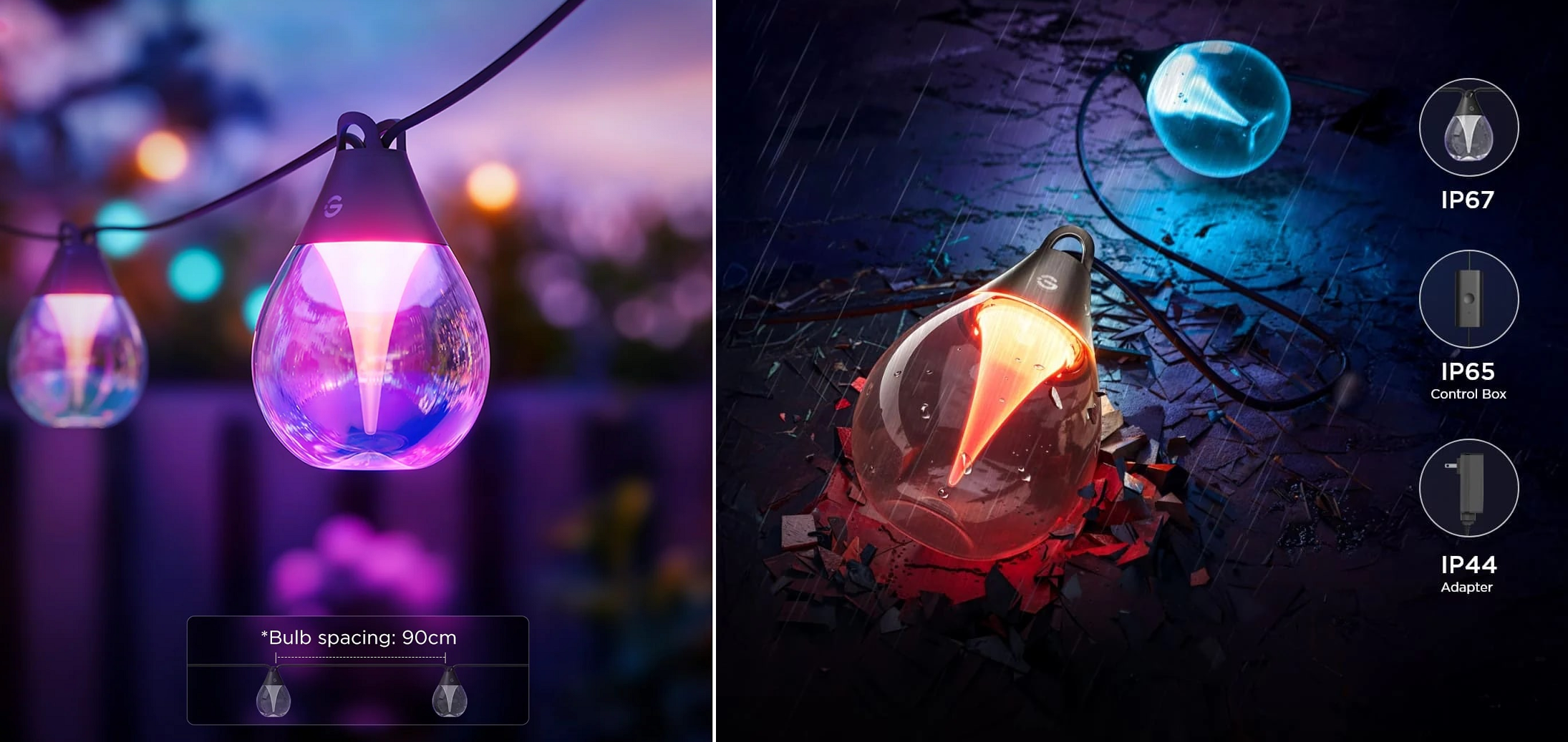 Гірлянда завдовжки 15 м із міцними прозорими лампочками з RGBIC-підсвічуванням та теплим білим світлом. Доступні 16 млн кольорів і понад сто попередньо встановлених режимів для будь-якої події. Корпус відповідає стандарту IP67, лампочки стійкі до ударів завдяки полікарбонату. У темний час доби гірлянда забезпечує тепле освітлення завдяки яскравості 1200 лм. Передбачено синхронізацію з музикою, можливість створення власних ефектів та керування через застосунок або голосові команди.