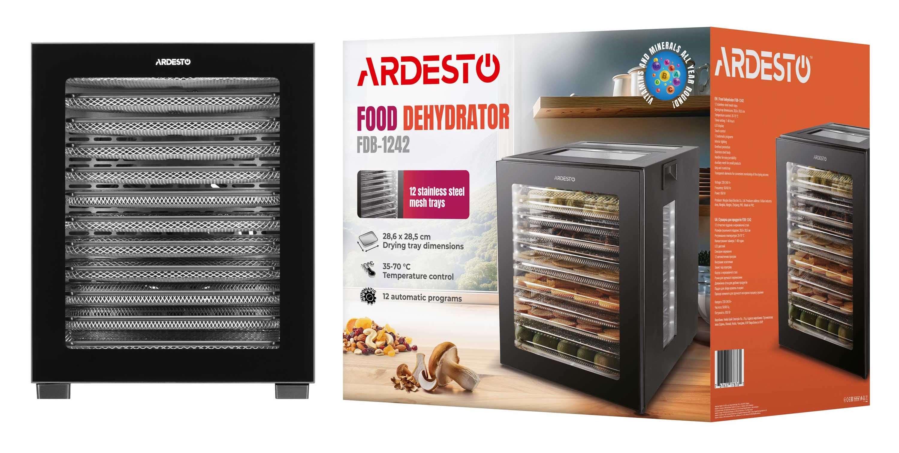 ARDESTO FDB-1242 – це стильний і потужний пристрій (850 Вт) для ефективного сушіння продуктів. Її оснащено 12 сітчастими піддонами з нержавіючої сталі, зумовлюючи оброблення великої кількості продуктів одночасно. Завдяки температурному діапазону від 35 до 70 °C і таймеру до 48 год забезпечено оптимальне налаштування процесу сушіння. Для зручності керування передбачено LED-дисплей, сенсорні кнопки та 12 автоматичних програм. Корпус і внутрішні елементи з нержавіючої сталі гарантують довговічність, а захист від перегрівання – безпеку використання. Пристрій оснащено внутрішнім освітленням для контролю процесу, руків’ям для легкого перенесення, додатковою сіткою для дрібних продуктів і піддоном для збирання крапель і крихт.