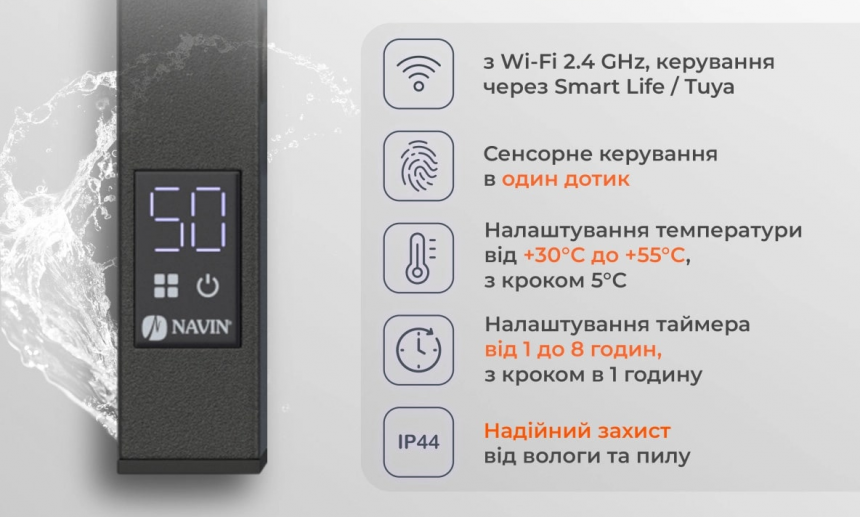 Ключова особливість – наявність модуля Wi-Fi із сенсорним керуванням. Крім того, керувати рушникосушаркою можна й дистанційно за допомогою фірмового застосунку Smart Life, регулюючи температуру, встановлюючи розклад роботи й оптимізуючи енергоспоживання. Такий функціонал робить експлуатацію максимально зручною і ефективною.