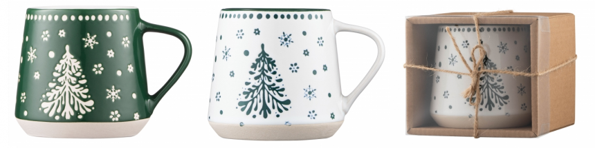 • Керамічні чашки Christmas New Year’s у зеленому, білому, червоному та молочно-бежевому виконанні формують зимовий настрій завдяки візерункам ялинок, оленів і сніжинок.