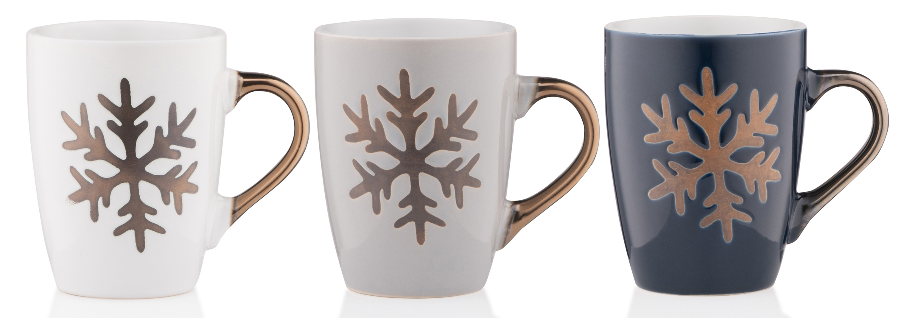 • Керамічна чашка Snowflake із золотистою ручкою та мінімалістським орнаментом формує стриманий святковий акцент.