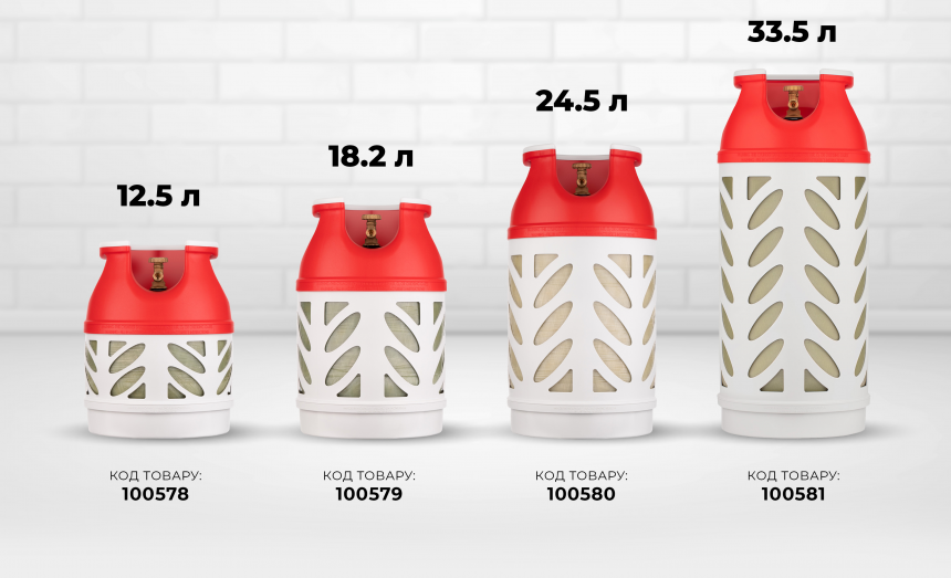 • HR12.5L (12,5 л) – пропан/бутан 5-6 кг, вентиль Shell (український стандарт), вага 3,9 кг (код товару: 100578);