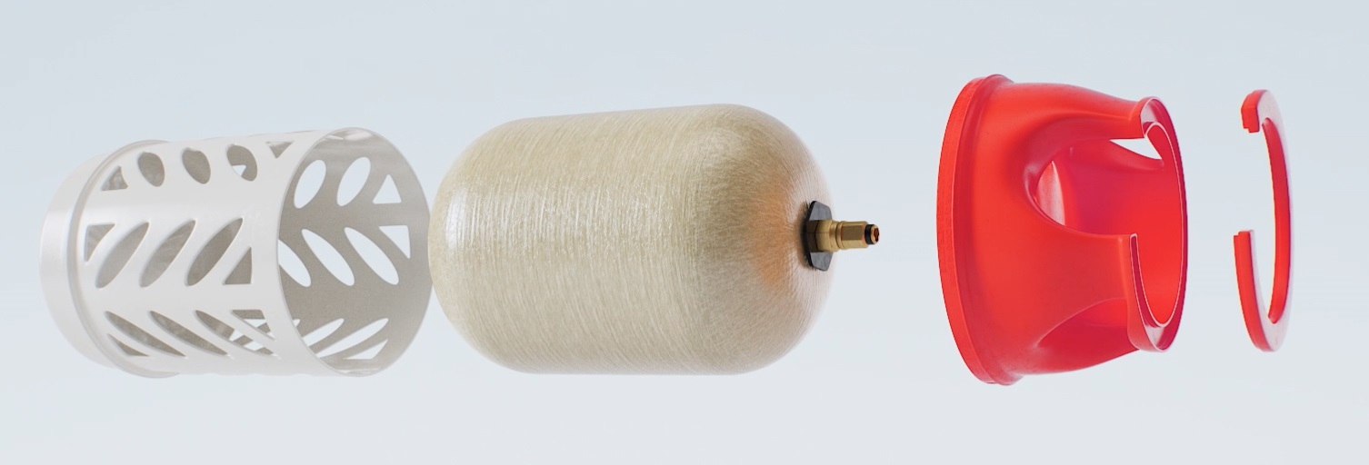 Балони виробляють на повністю автоматизованому підприємстві в місті Рауфосс (Норвегія). Конструкцію виготовлено з композитних полімерних матеріалів: шар скловолокна забезпечує міцність, а епоксидна смола – стійкість до корозійних і хімічних впливів. Полімерний кожух захищає вентиль і полегшує транспортування завдяки інтегрованим руків’ям.