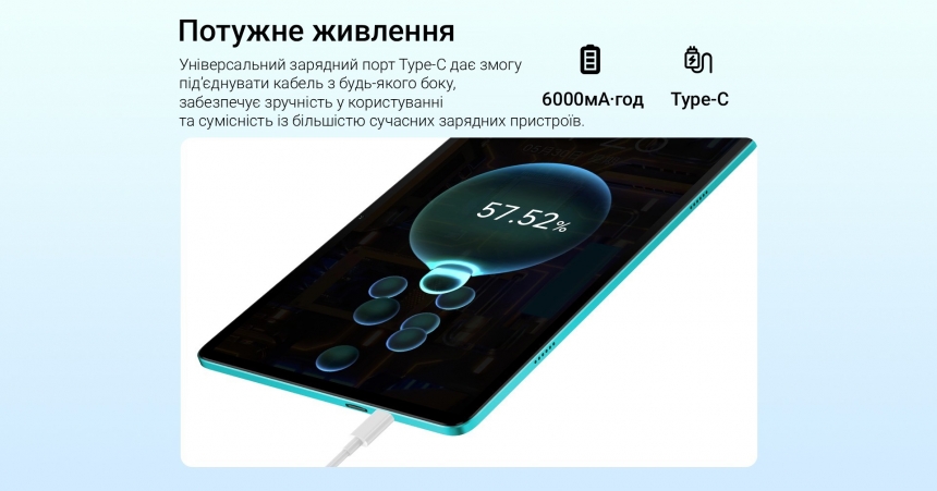 Батарея 6 000 мА·год забезпечує до 7 год відео або 5,5 год вебсерфінгу. У перекладі на «шкільний час» – це повний день уроків плюс домашнє завдання на одному заряді. Металева рама корпусу додає конструкції жорсткості, що є обов’язковою умовою для пристрою, призначеного для дітей. Вага 535 г залишається комфортною для шкільного рюкзака.