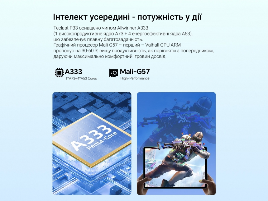 Серцем планшета є новий енергоефективний чипсет Allwinner A333 (12 нм). Це цікаве рішення з нетиповою конфігурацією ядер: