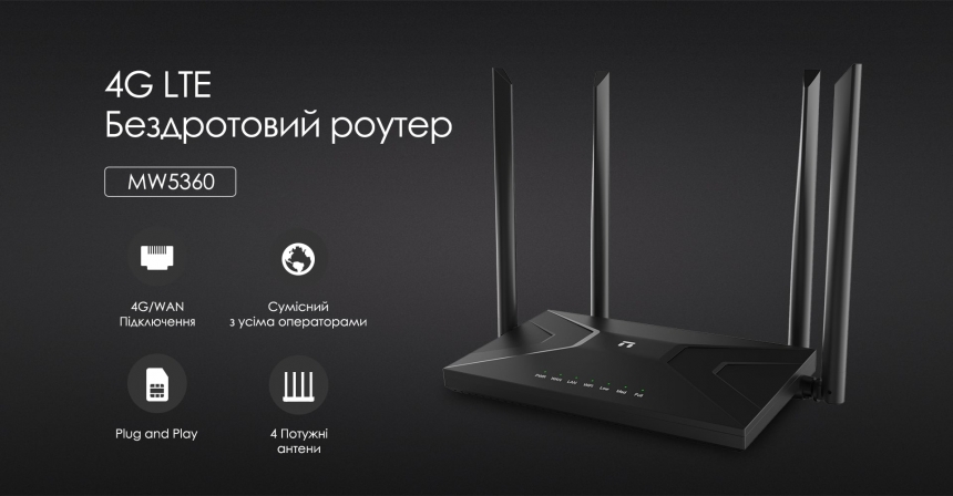Netis MW5360 поєднує можливості 4G/LTE та класичного бездротового маршрутизатора. Підключення до мережі можливе через SIM-карту або порт WAN, що робить модель універсальною для використання на дачах, у заміських будинках і на тимчасових локаціях.