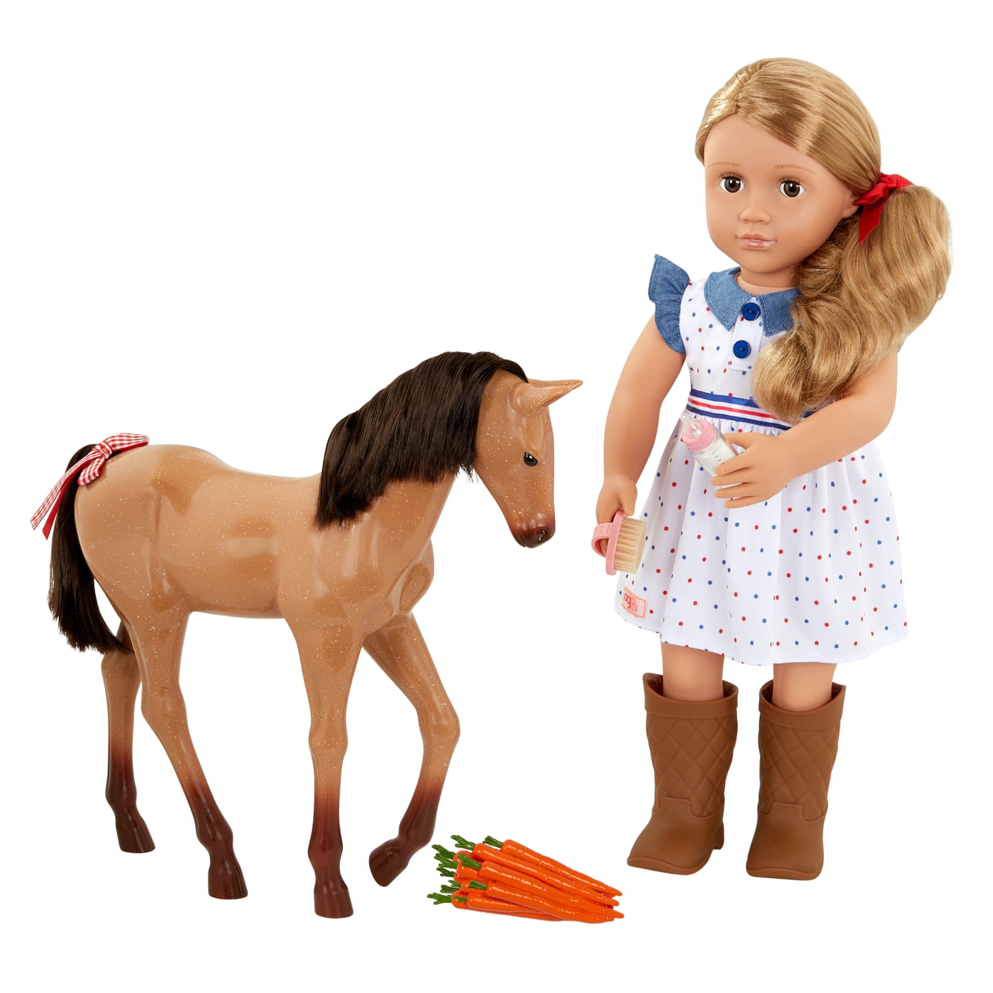Ця невелика конячка кремового кольору з блискучою гривою буде доречною для ігор, де є турбота та догляд. У наборі вже дитина знайде все необхідне: щітки для грумінгу, ковдру, повідець і дрібнички, які зроблять гру цікавішою. Це чудовий вибір для маленьких мрійників.