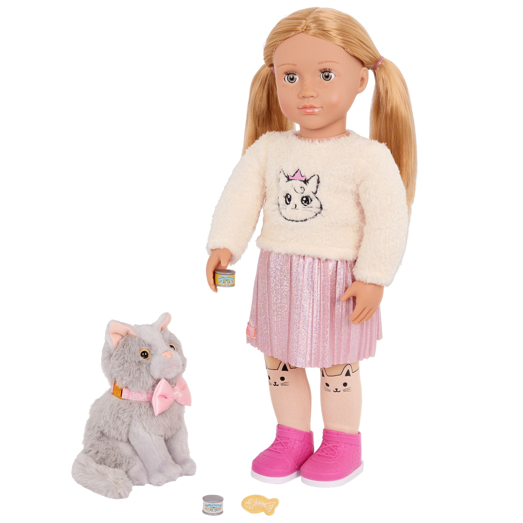 Гарний вибір для історій про дружбу та відповідальність. Корм, іграшки та гребінець допоможуть дитині піклуватися про кошеня. Ляльку легко перевдягати, що додає грі нових відтінків.