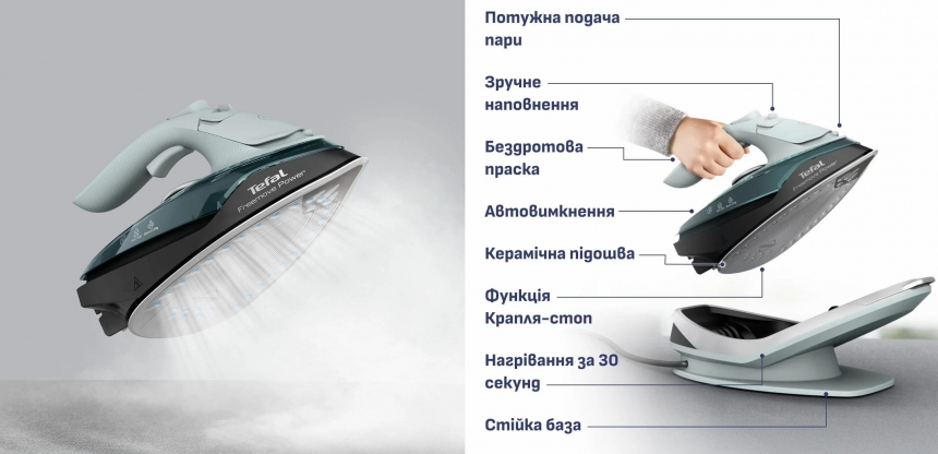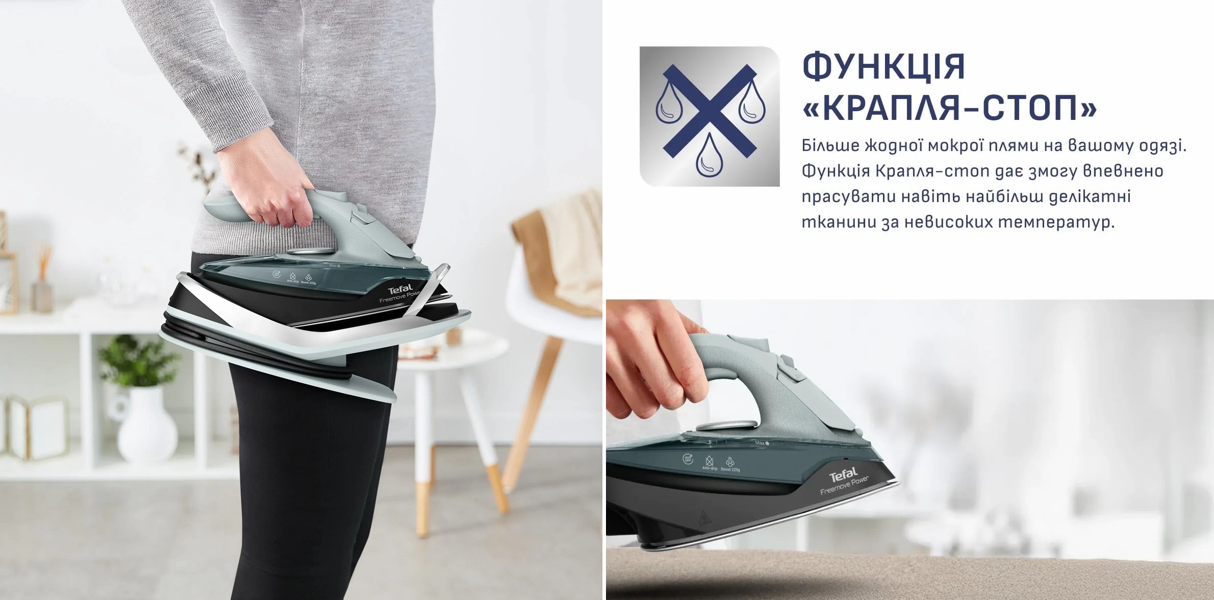 Головною перевагою Tefal Freemove Power FV6670E0 є бездротовий формат роботи. Праска заряджається на компактній базі та забезпечує вільний рух під час прасування. Відсутність кабелю значно підвищує маневреність, спрощує оброблення великих виробів і робить процес більш зручним і безпечним.