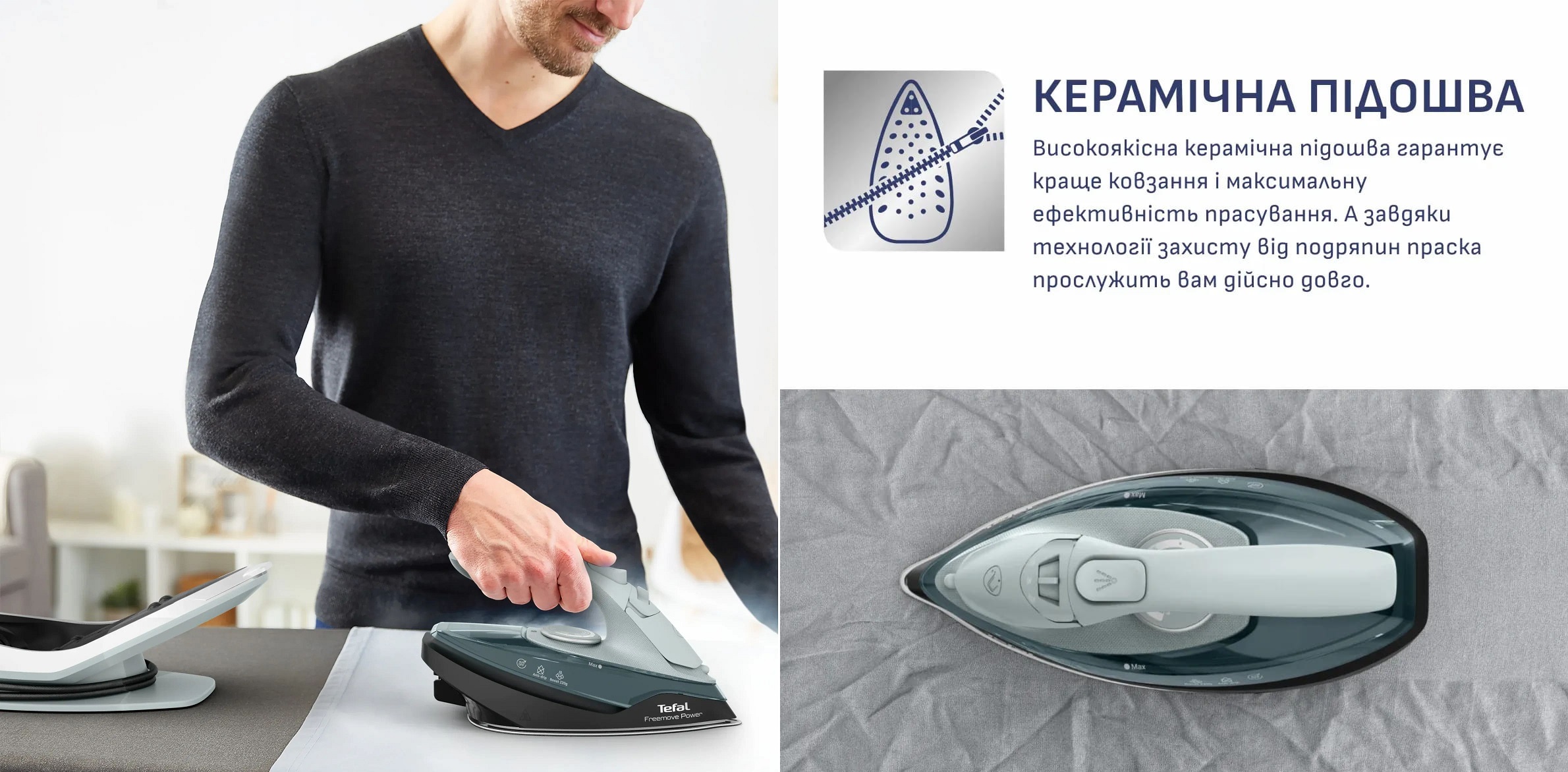 Керамічна підошва забезпечує плавне ковзання та рівномірний розподіл тепла. Функція «Крапля стоп» запобігає появі плям на тканині, а система автоматичного вимкнення підвищує безпеку експлуатації. Конструкція продумана для стабільної та комфортної роботи за щоденного режиму.