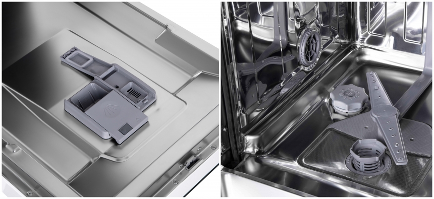 Внутрішній простір спроєктовано з урахуванням різного формату кухонного начиння. Регульований верхній кошик, розкладні полиці на верхньому та нижньому рівнях, окремі полиці для кухлів (4 шт.) і знімний кошик для столового приладдя спрощують розміщення посуду та сприяють якісному миттю.