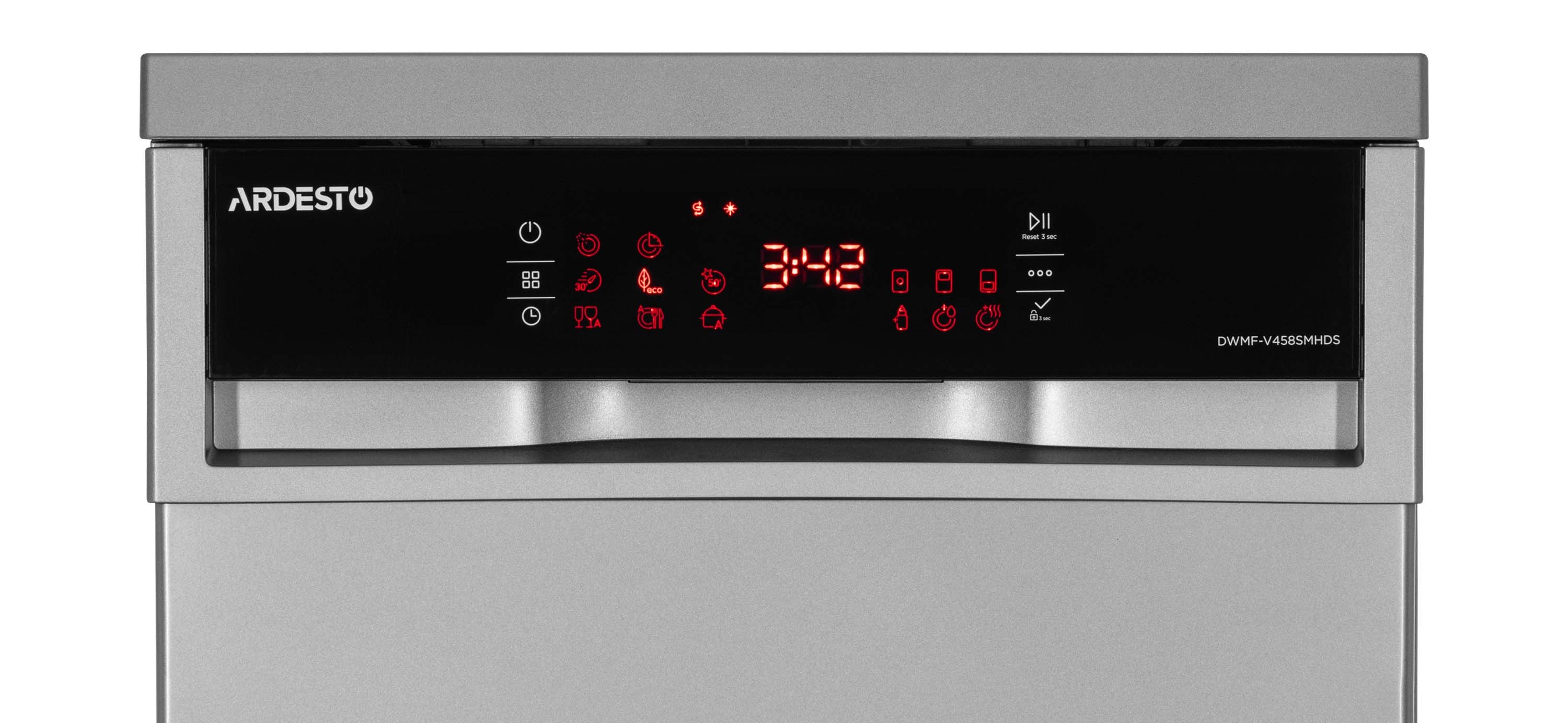 Окремостояча модель завширшки 45 см розрахована на миття до 10 комплектів посуду, зберігаючи баланс між місткістю та економією простору. Для зручного контролю за роботою передбачено великий цифровий LED-дисплей, на якому відображається перебіг циклу миття, інформація про наявність солі та мийного засобу, а також індикатори завершення програми.