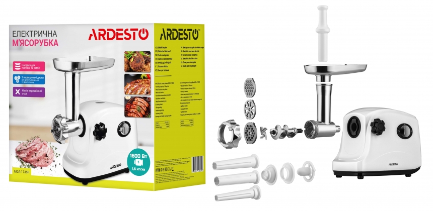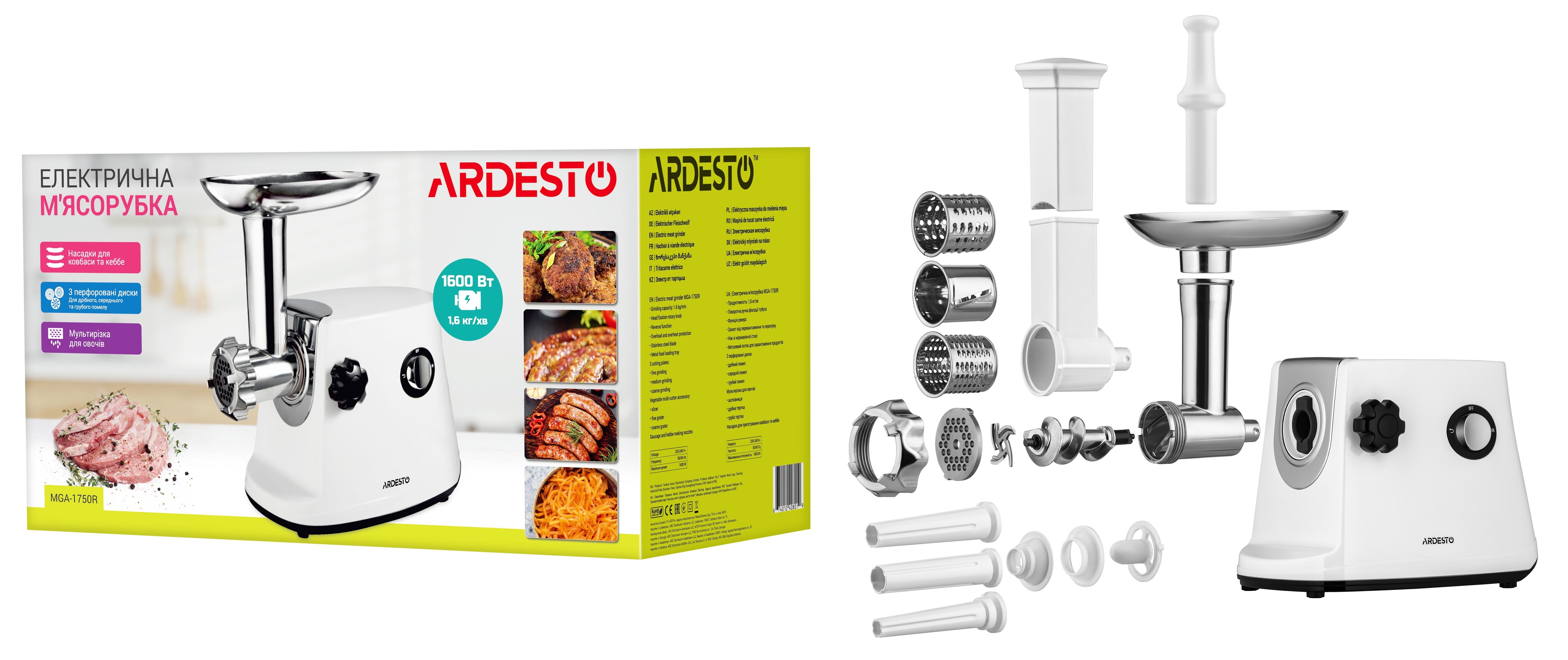 Модель ARDESTO MGA-1750R поєднує потужність 1 600 Вт і продуктивність 1,6 кг/хв, що дає можливість без зайвих зусиль працювати з м’ясом різної структури. Функція реверсу спрощує очищення шнека, а система захисту від перевантаження підвищує надійність під час активного використання. Комплект із трьох решіток, насадок для ковбас і кеббе, а також трьох терток перетворює м’ясорубку на багатофункціональний кухонний інструмент. Біло-сріблястий пластиковий корпус органічно пасуватиме до сучасного інтер’єру кухні.
