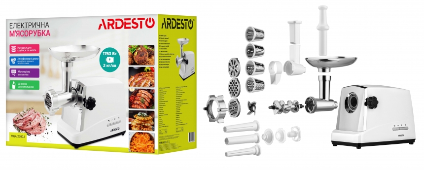 Для інтенсивнішого навантаження доступна модель ARDESTO MGA-2300J. Потужність до 1 750 Вт і продуктивність 2 кг/хв дають змогу швидко обробляти великі обсяги продуктів. Модель доповнено чотирма тертками, що розширює сценарії використання – від м’яса до овочів. Передбачено реверс, систему захисту від перевантаження, знімний шнек і повний набір решіток, зокрема для ковбасок і кеббе.