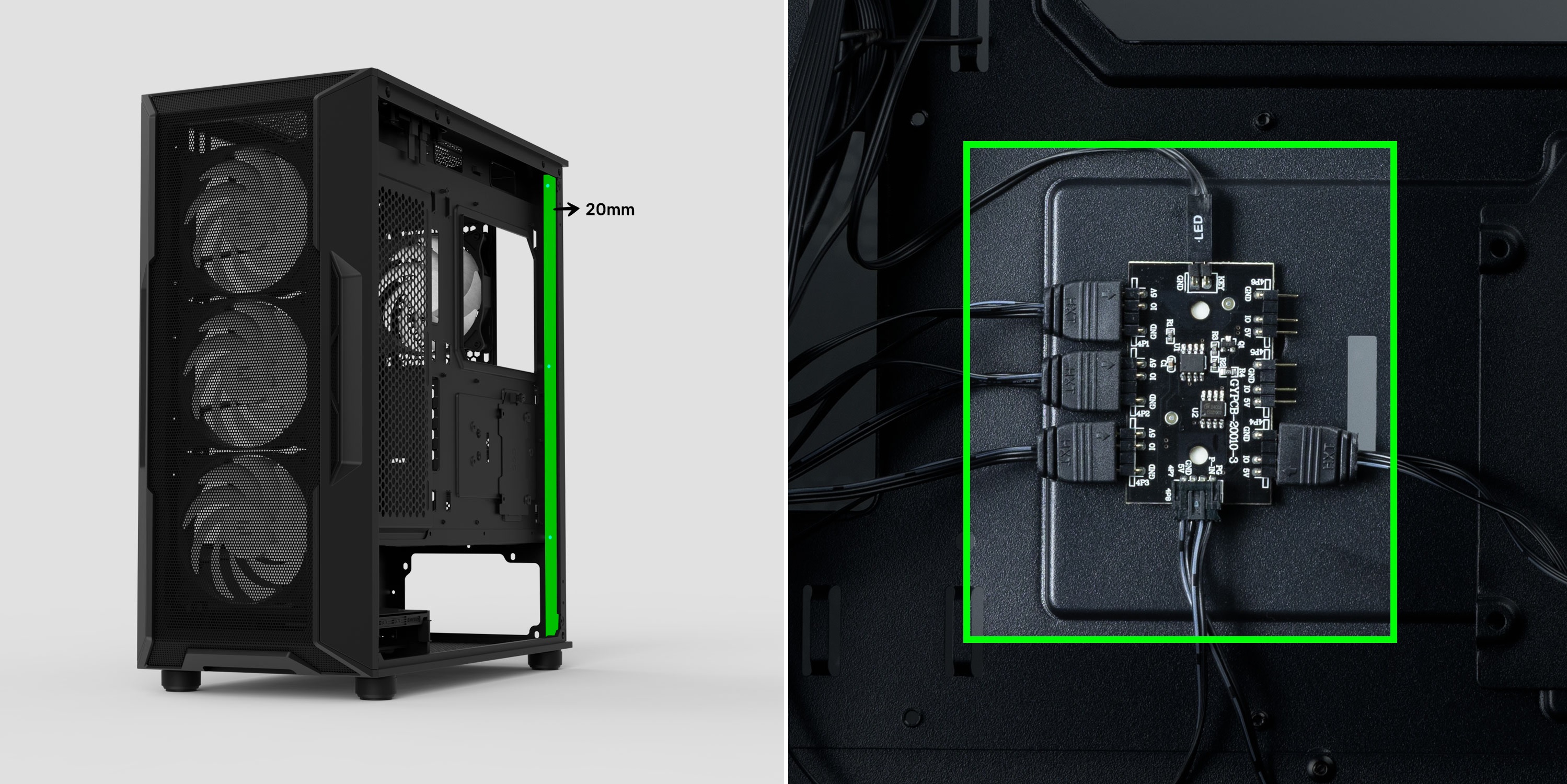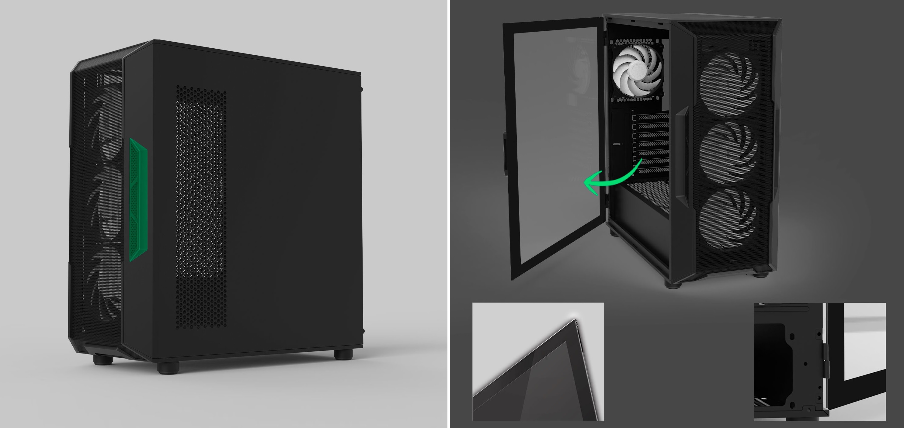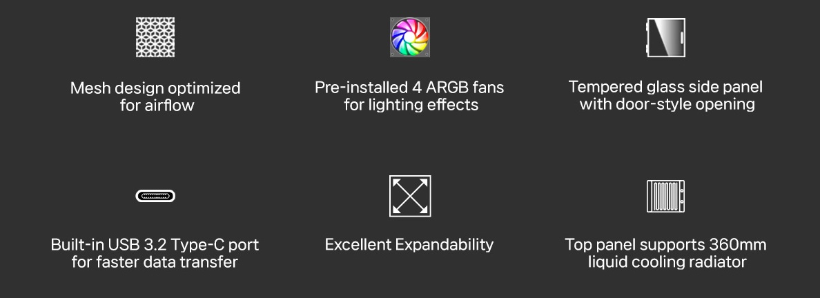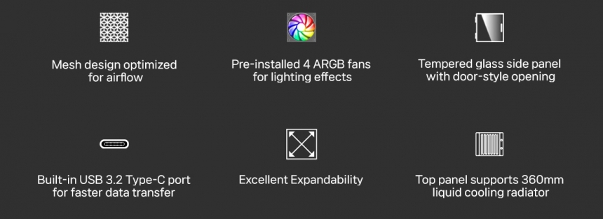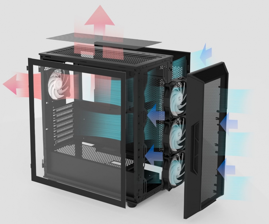 У стандартній конфігурації корпус оснащено чотирма 120-мм RGB-вентиляторами: трьома на передній та одним на задній панелі. Загалом передбачено достатньо простору для восьми вентиляторів, також є місце для розміщення процесорного охолодження заввишки до 160 мм.