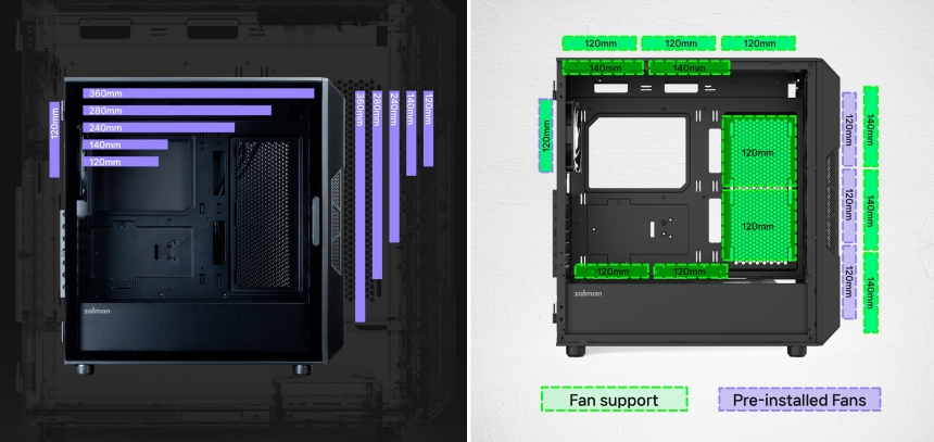 На передню і верхню панелі можна змонтувати системи одно- (120/140 мм), дво- (240/280 мм) або трисекційного (360 мм) рідинного охолодження, додатково на задню панель – односекційну (120 мм).