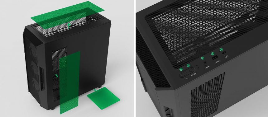 Для підтримання чистоти всередині корпусу передбачено два пилові фільтри, які легко зняти й очистити: магнітний фільтр розміщено на верхній панелі, а стандартний – на нижній. Кнопки керування живленням і перезавантаженням, аудіоінтерфейси, розніми USB 3.0 (2 шт.) і Type-C вбудовано на верхній панелі.