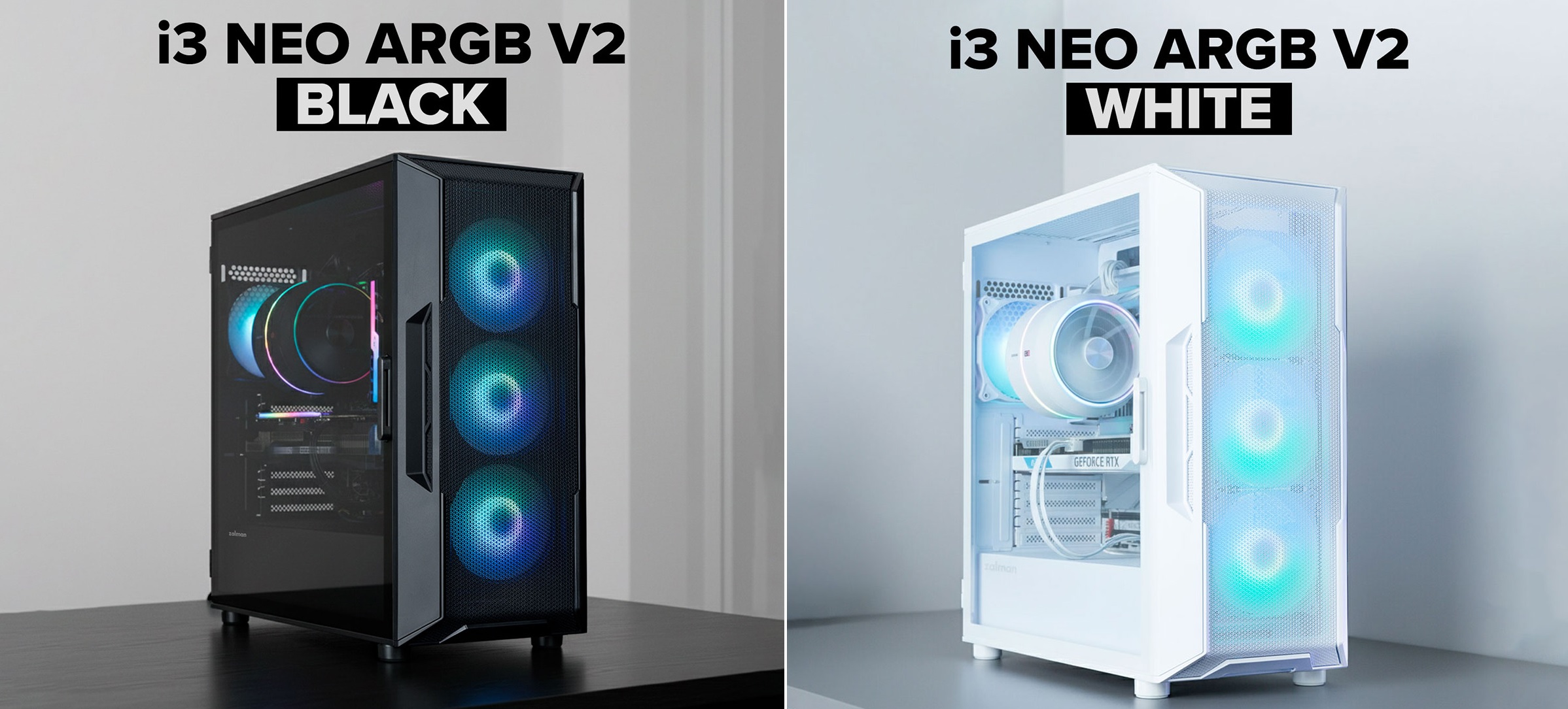 Корпус Zalman I3NEO наявний чорного та білого кольорів – моделі BLACK V2 та WHITE V2. Оновлену модифікацію орієнтовано на сучасні домашні або ігрові ПК; пристосовано до промислової або самостійної збірки. Завдяки різноманітному асортименту Zalman кожному вдасться вибрати оптимальне рішення і втілити власні ідеї в життя.