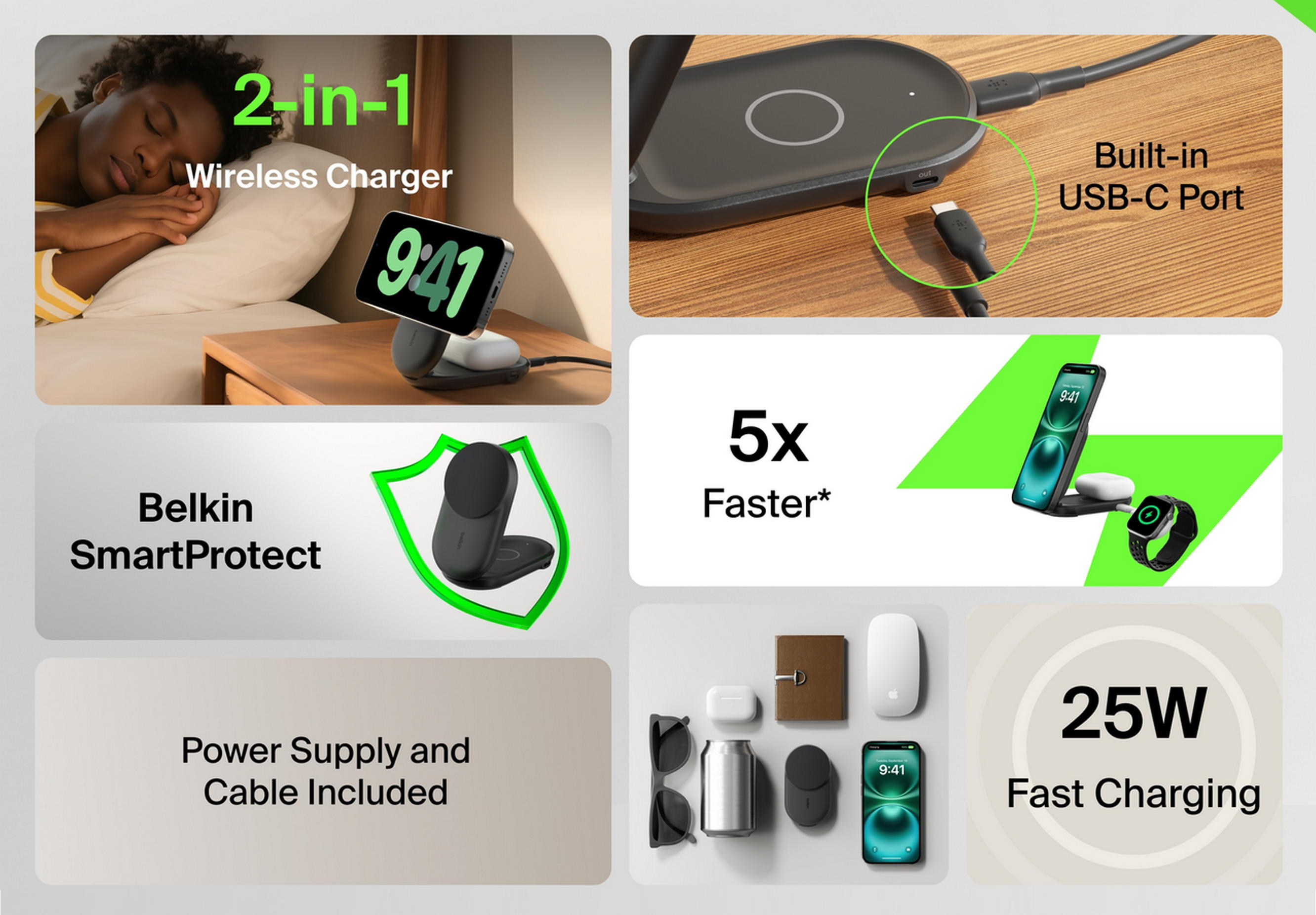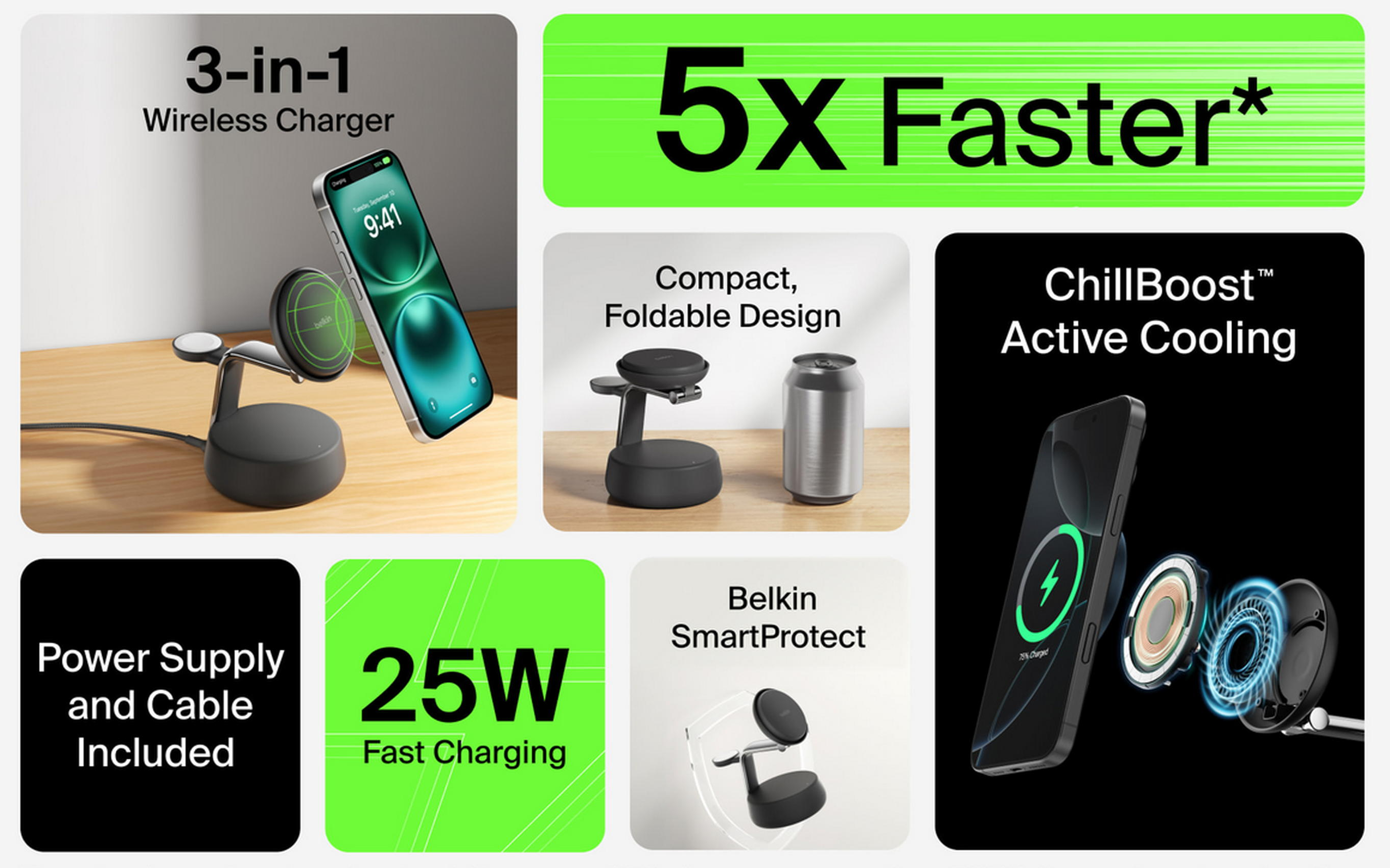 Моделі Belkin UltraCharge 2 в 1 Foldable Magnetic Charging 25 Вт (коди товарів: WIZ039KQWH, WIZ039KQBK) поєднують складану конструкцію та можливість одночасного заряджання двох пристроїв. Охолодження ChillBoost passive гарантує стабільну роботу за потужності до 25 Вт. У комплекті передбачено блок живлення на 45 Вт із кабелем USB-C – USB-C завдовжки 1,5 м.