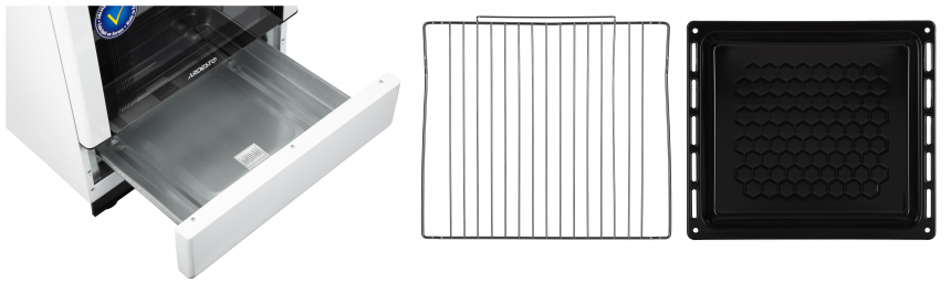 Для зберігання кухонного приладдя передбачено містке висувне нижнє відділення. У комплекті – деко та решітка. Розмір плити 85 × 60 × 60 см і вага 41 кг відповідають стандартам повнорозмірних моделей.
