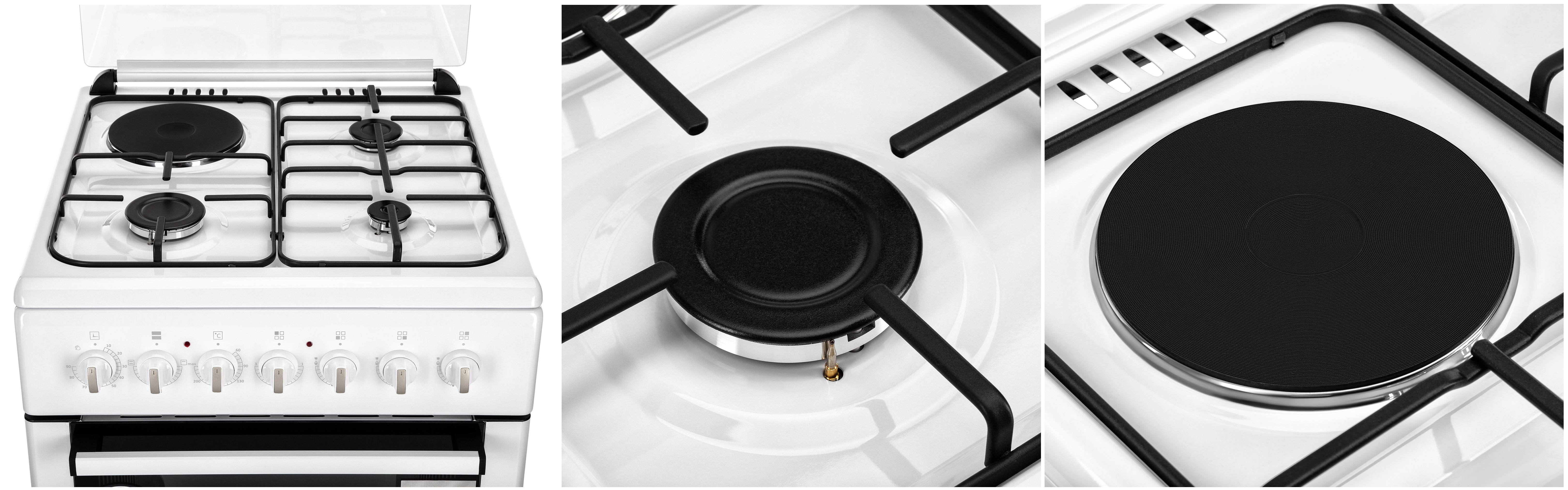 Варильну поверхню змішаного типу оснащено чотирма конфорками різної потужності: трьома газовими та однією електричною. Така конфігурація забезпечує можливість вибирати оптимальне джерело нагрівання залежно від потреб чи доступного ресурсу. Автоматичне запалювання інтегровано в руків’я, що спрощує керування. Система газ-контролю підвищує рівень безпеки, до того ж для використання скрапленого газу в комплекті передбачено форсунки LPG.