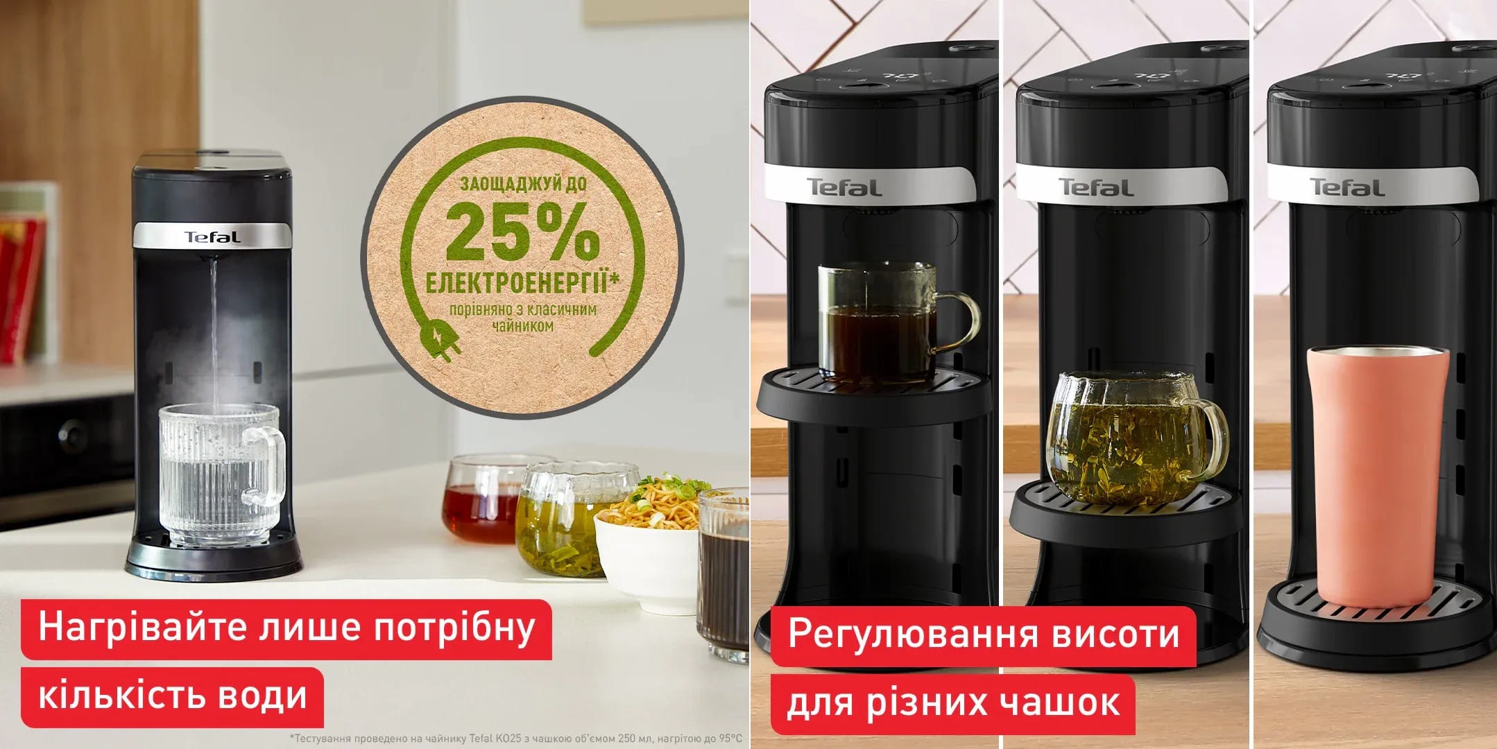 Конструкцією передбачено регулювання об’єму порції, що дає змогу точно дозувати воду для чашки або термокухля. Кілька температурних режимів розширюють можливості використання – від чаю і кави до приготування швидких страв.
