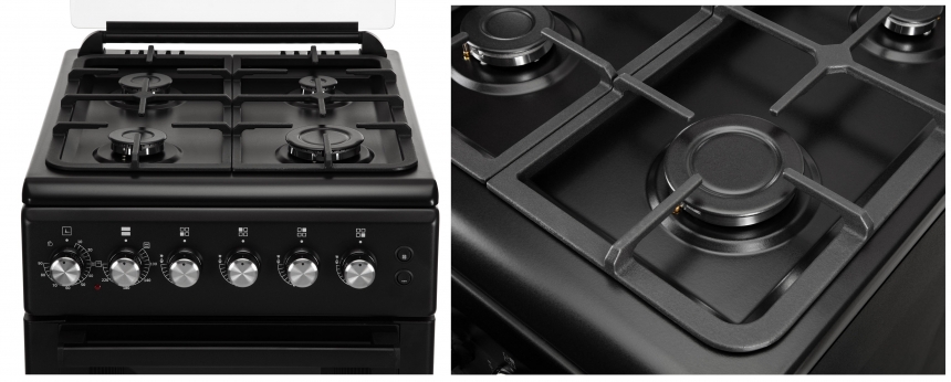 Для зручності передбачено автоматичне запалювання, інтегроване в ручки керування. За безпеку відповідає система газ-контроль: якщо полум’я випадково згасне, подавання газу припиниться автоматично. У періоди, коли плиту не використовують, поверхню можна закрити скляною кришкою.