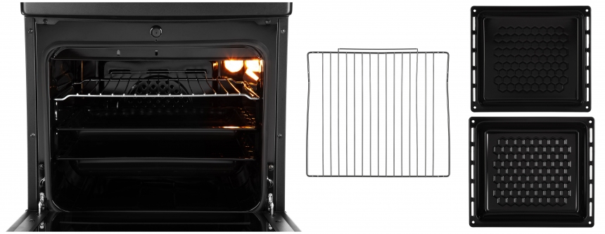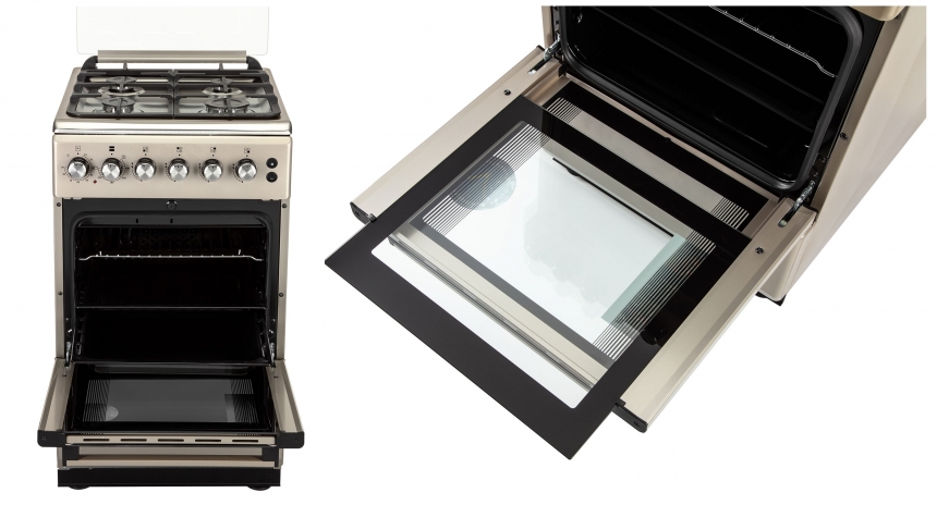 Завдяки технології Cool Door із подвійним склом мінімізовано нагрівання зовнішньої панелі дверцят, а знімне внутрішнє скло значно спрощує догляд. Для контролю процесу приготування передбачено механічний таймер і внутрішнє освітлення потужністю 15 Вт.