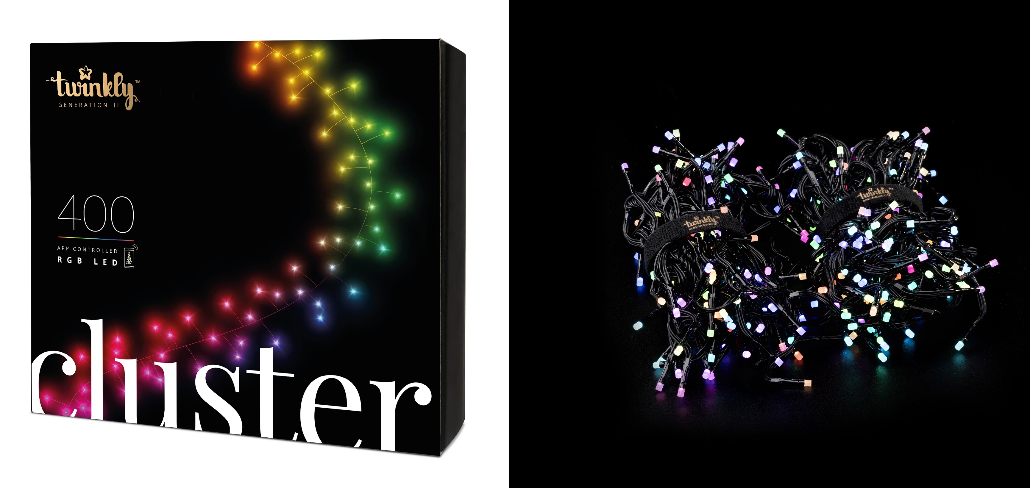 Twinkly Cluster RGB TWC400STP-BEU - новітня різнокольорова світлодіодна гірлянда. Cluster - незвичайна гірлянда, в ній LED лампочки розташовано як голки на соснової гілці. LED лампи на "сосновій іглиці" 7см завдовжки слідують одна за одною на відстані 1,5 см і спрямовані на всі боки (на 360°) навколо такої 6-ти метрової "гілки". При вмиканні ефект вражає. Найліпше гірлянда Cluster підкреслює лінії, контури. Її в більшості випадків досить просто укласти на поверхню прямою лінією або візерунком.