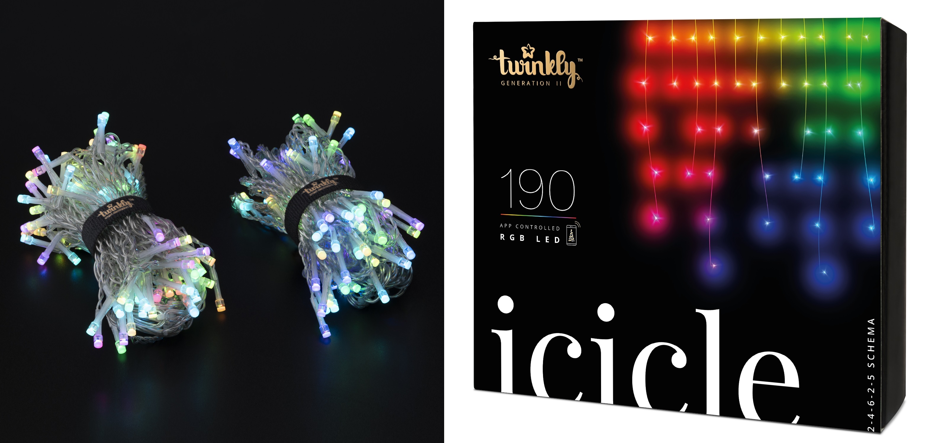Smart LED Гірлянда Twinkly™ Icicle RGB TWI190STP-TEU - новітня світлодіодна гірлянда Twinkly. Icicle - своєрідна гірлянда, в ній LED лампочки розташовано періодично-послідовними сегментами різної довжини кожні 10 см. Це нагадує бурульки (icicle) під дахом. Сегменти періодичні за схемою та кількістю ламп в них: 2-4-6-2-5, 2-4-6-2-5, ... й так 10 разів поспіль. Кабель живлення підведено між 5-м та 6-м сегментами, тож він неначе ділить гірлянду на два крила 2,5 м завдовжки кожне (і кожне має 5 сегментів 2-4-6-2-5). При вмиканні, якщо розташувати Icicle десь на висоті, ефект буде дійсно, як від бурульок, але неймовірно сяючих. Найкраще Icicle підкреслює лінії, контури на висоті, проте годиться й для обмотування, вистилання, заповнення простору, тощо.