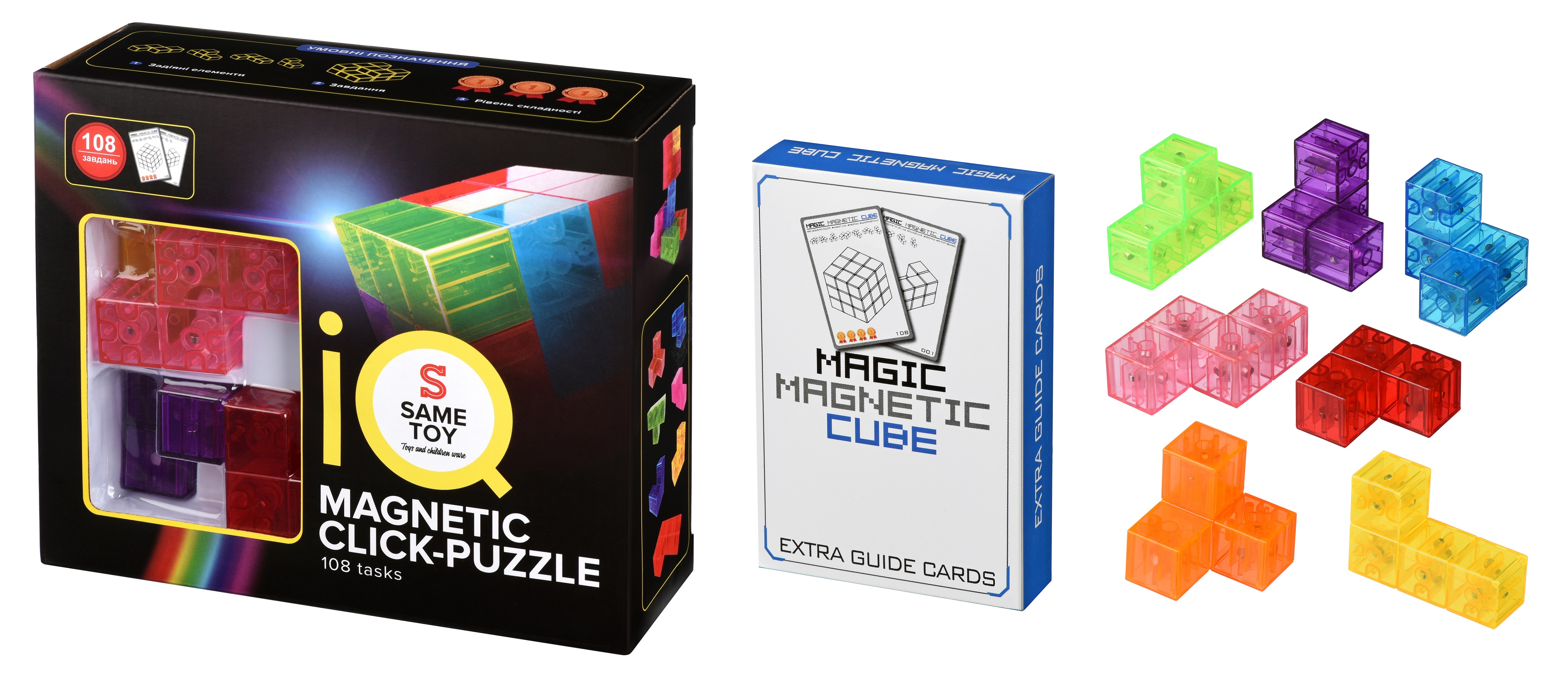 IQ магнітний клік-пазл, який складається із семи блоків різної форми і кольору. У наборі є 54 двосторонні картки з 108 завданнями різного рівня складності. Необхідно розташувати деталі згідно з інструкцією на картці, щоб зібрати задану фігуру. Завдяки магнітам всередині блоків деталі легко з'єднуються між собою, утворюючи єдину конструкцію. Сім окремих частин магнітного клік-пазла можна скласти у велику кількість комбінацій. Рекомендований вік: 3+