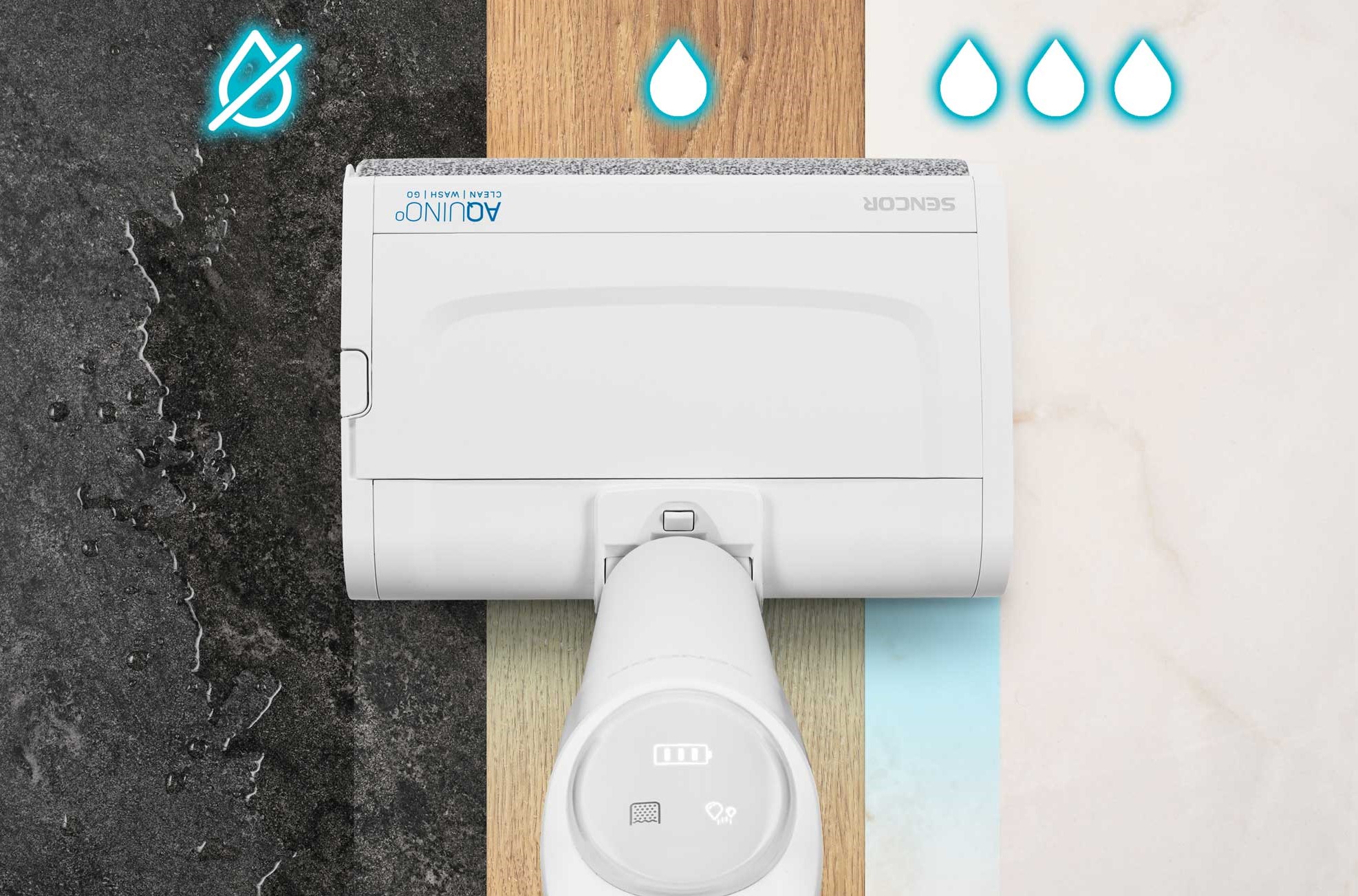 Sencor SVW3500WH оснащено системою Power Spin Aqua 8 – особливою обертовою щіткою з постійним подаванням чистої води, яка ефективно та якісно видаляє забруднення з твердих підлогових поверхонь. Такий механізм дає змогу не просто пилососити, а й мити підлогу водою, не залишаючи патьоків чи плям.