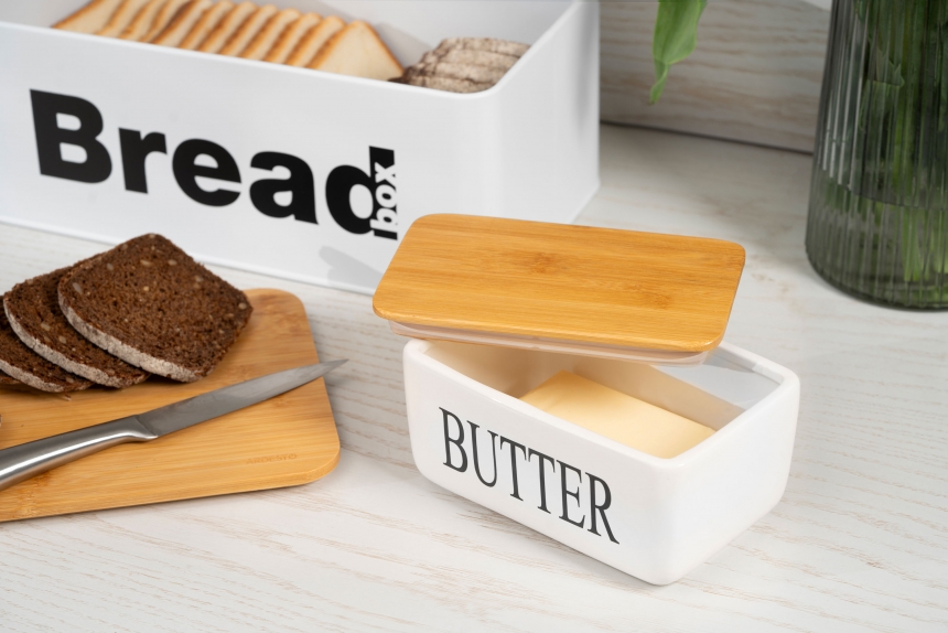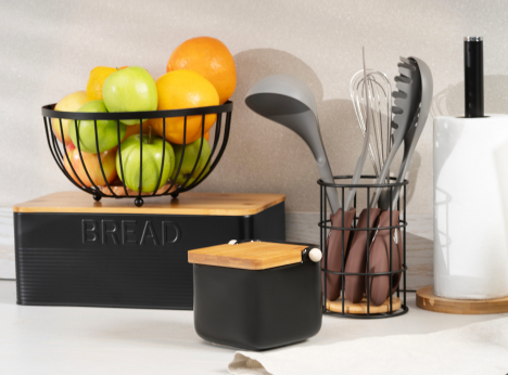Серія товарів для зберігання ARDESTO Midori охоплює ключові позиції для організації робочої поверхні: підставки для кухонного приладдя, маслянки, цукорниці, кошики, тримачі для паперових рушників і хлібниці. Усе в єдиному стилі – чорний або білий метал + бамбук, що створює особливий естетичний шарм в інтер’єрі кухні.